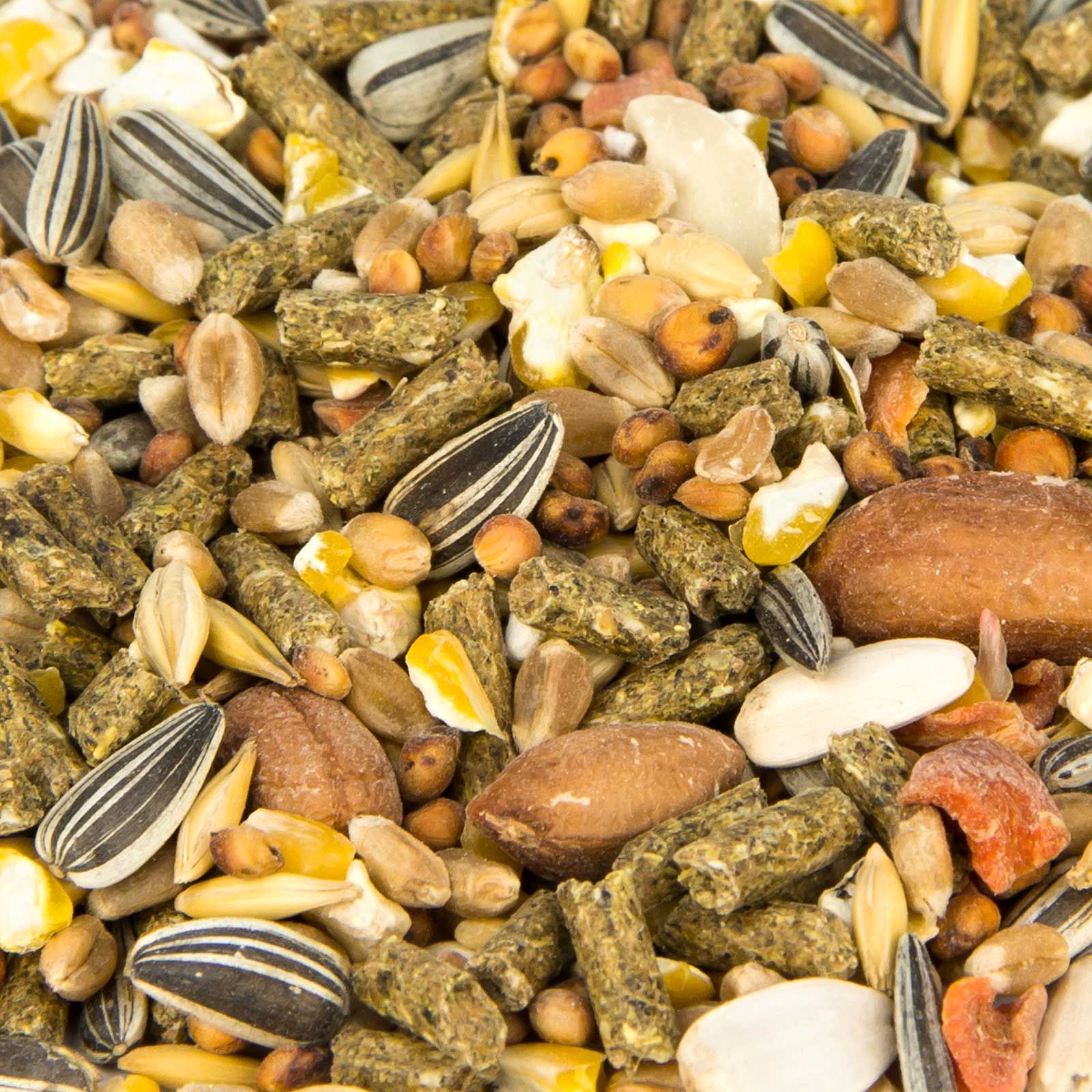 Blé, maïs moulu grossièrement, milokorn, graines de tournesol rayées, son de blé grossier, farine verte, avoine, orge de brasserie, arachides "peau rouge", graines de tournesol blanches, cubes de carotte, concentré de maïs, pulpe séchée, farine d'extraction de colza avec bâtonnet, tourteau de graines de courge, mélasse, lignocellulose, carbonate de calcium, phosphate monocalcique, chlorure de sodium, bicarbonate de sodium, oxyde de magnésium