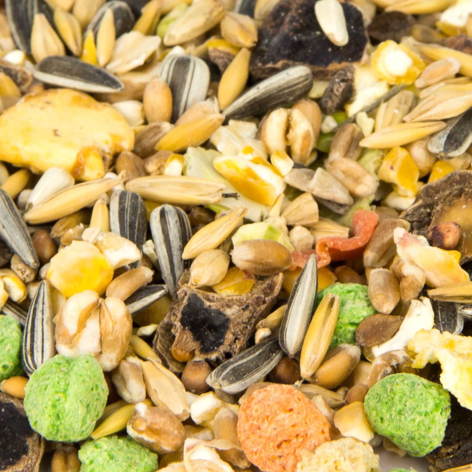 Maïs moulu grossièrement, blé, graines de tournesol rayées, avoine, grain de milo, orge de brasserie, maïs éclaté, blé éclaté, caroube coupée, flocons de pois, croquettes de maïs vert, cardamome, croquettes de maïs rouge, croquettes de maïs jaune