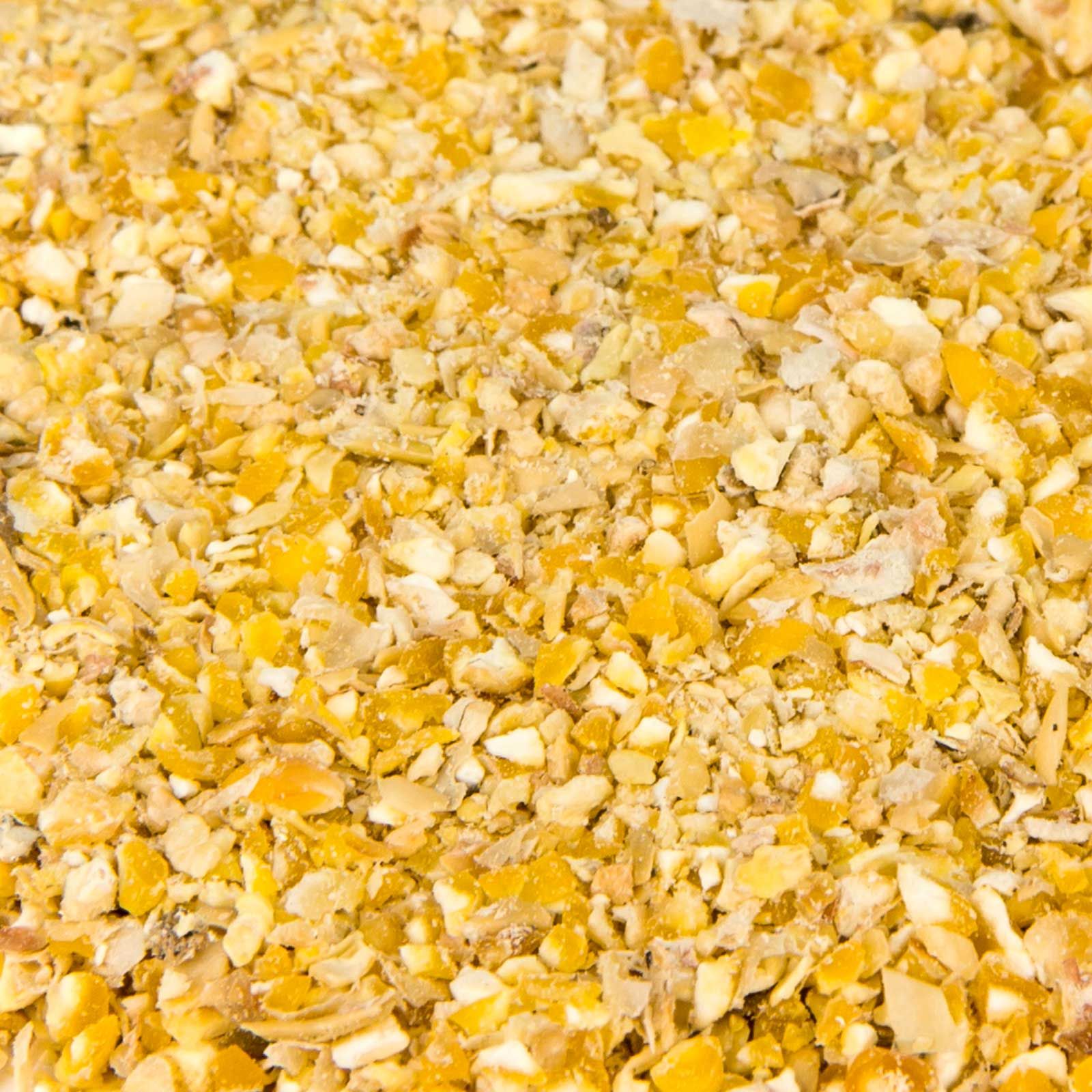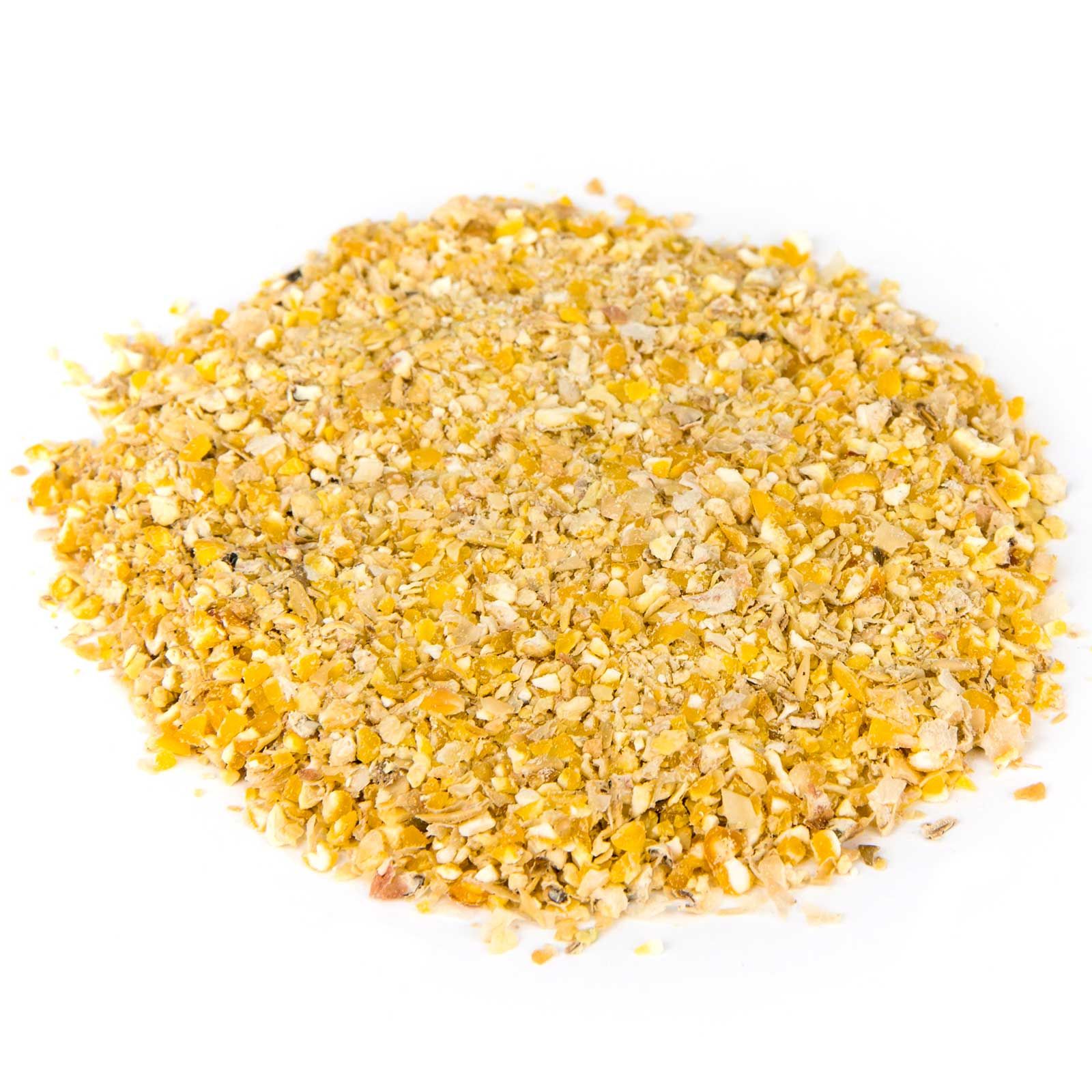 Semoule de maïs, farine d'extraction de soja (fèves) avec pâte à savon (chauffée à la vapeur), huile de tournesol, sable de moules, phosphate monocalcique, carbonate de calcium, chlorure de sodium