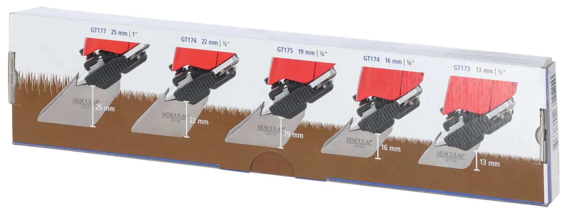 Le jeu de 5 peignes de fixation est compatible avec les têtes de tondeuses Aesculap Favorita GH700, GT736, GT746 et GT710.
