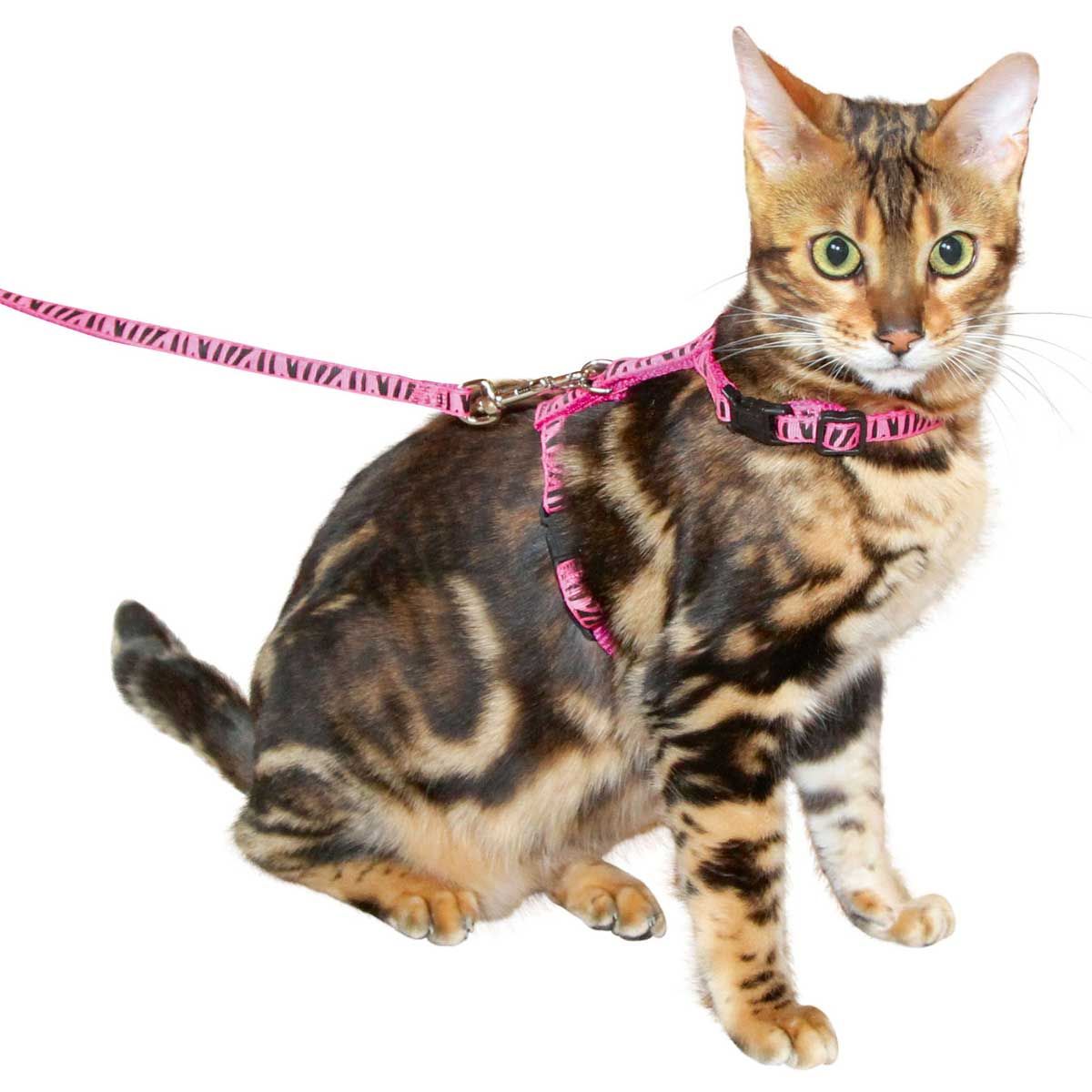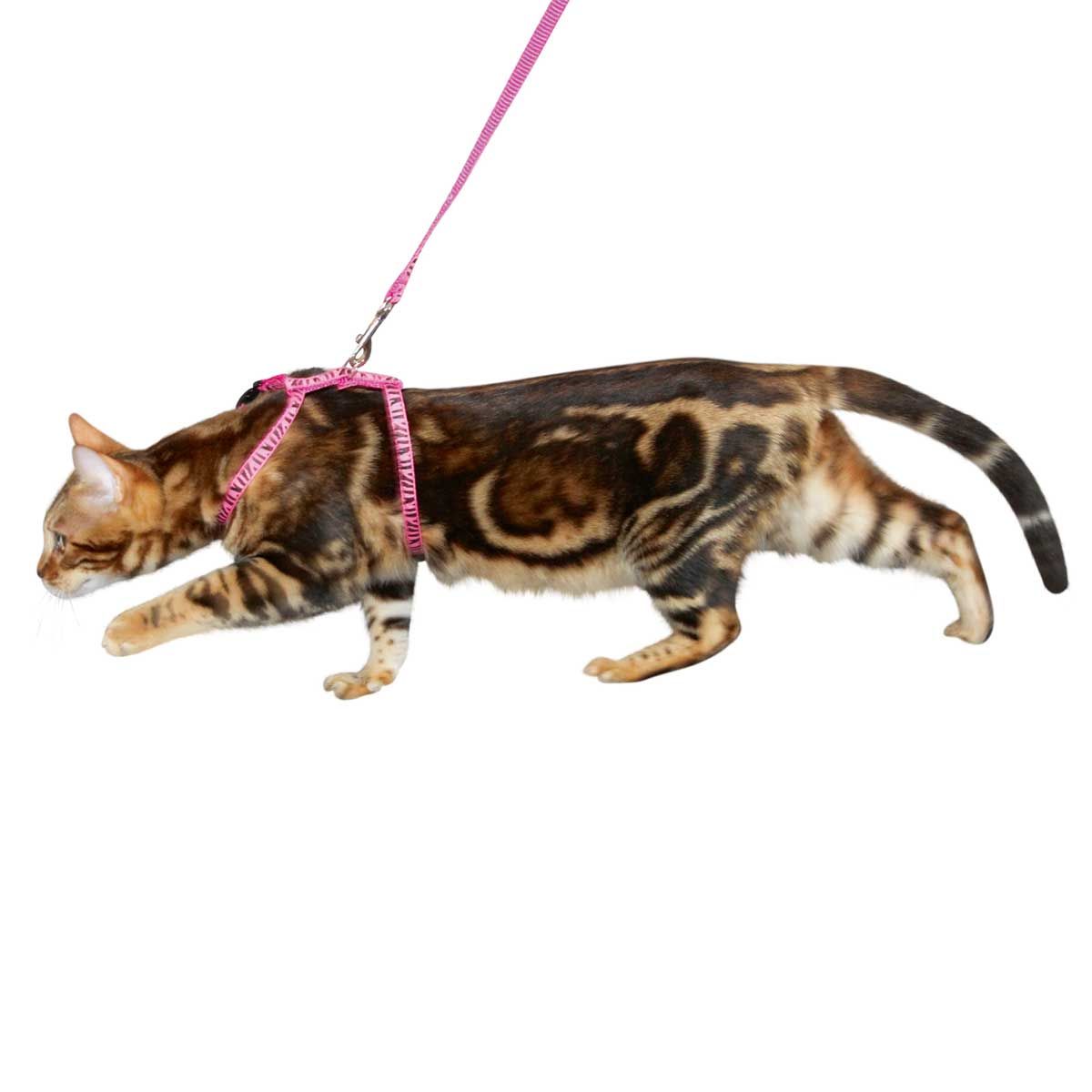 La laisse rose est en nylon avec un imprimé zèbre. Le harnais pour chat se ferme avec des fermetures à clic. La laisse mesure 120 cm de long et 10 mm de large.