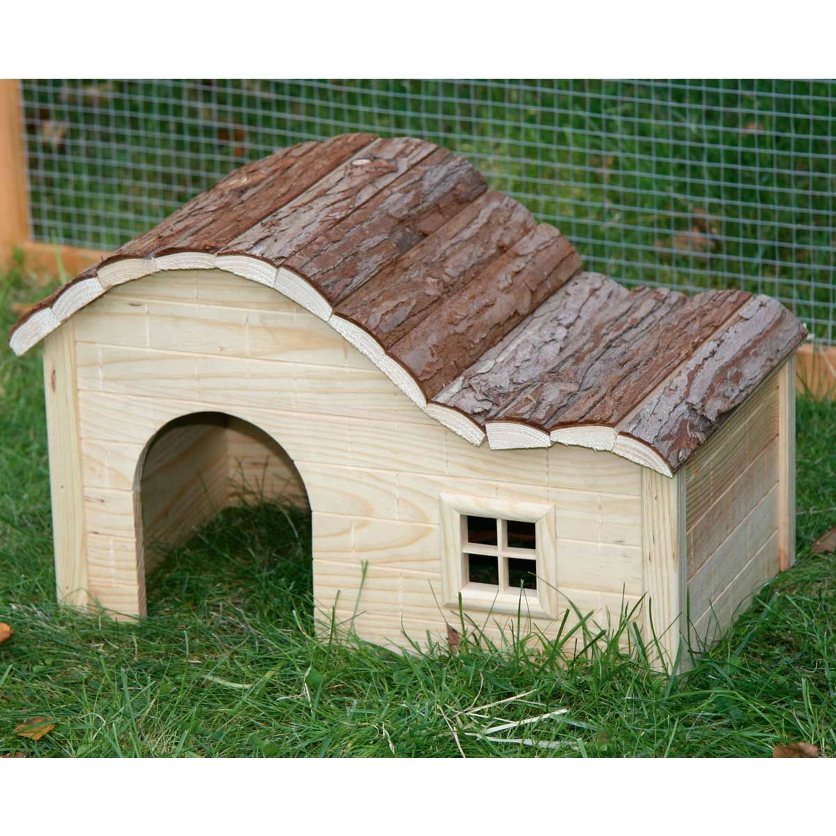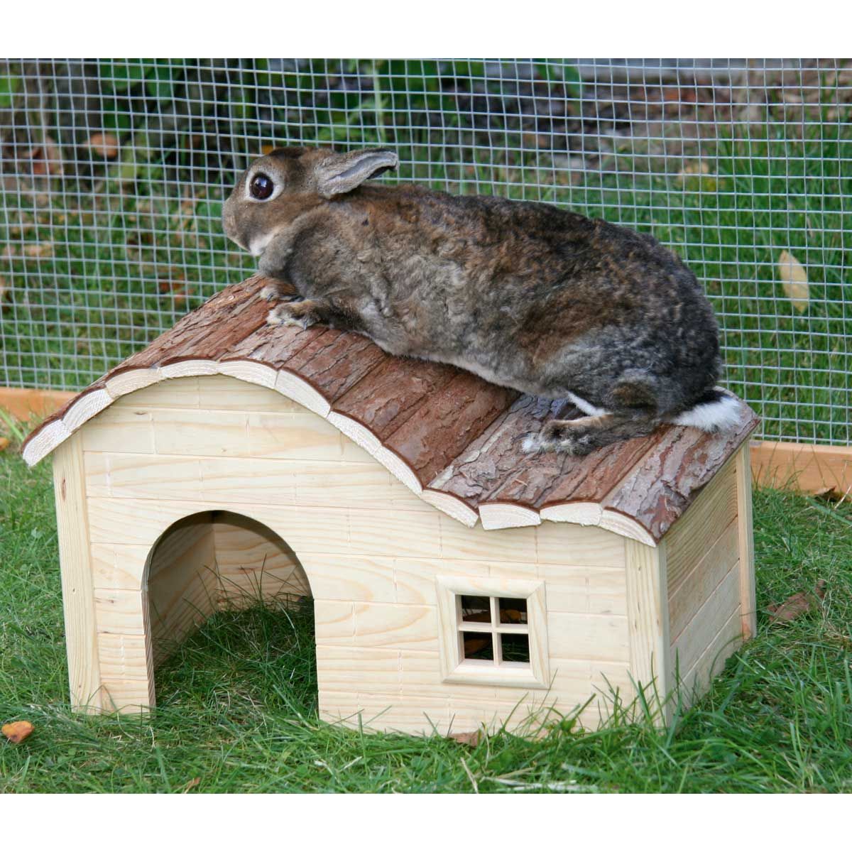 La maison pour rongeurs est un abri bienvenu pour tous les petits animaux comme les lapins nains ou les cochons d'Inde. Le bois utilisé est entièrement naturel et non traité, il peut donc être rongé sans crainte.