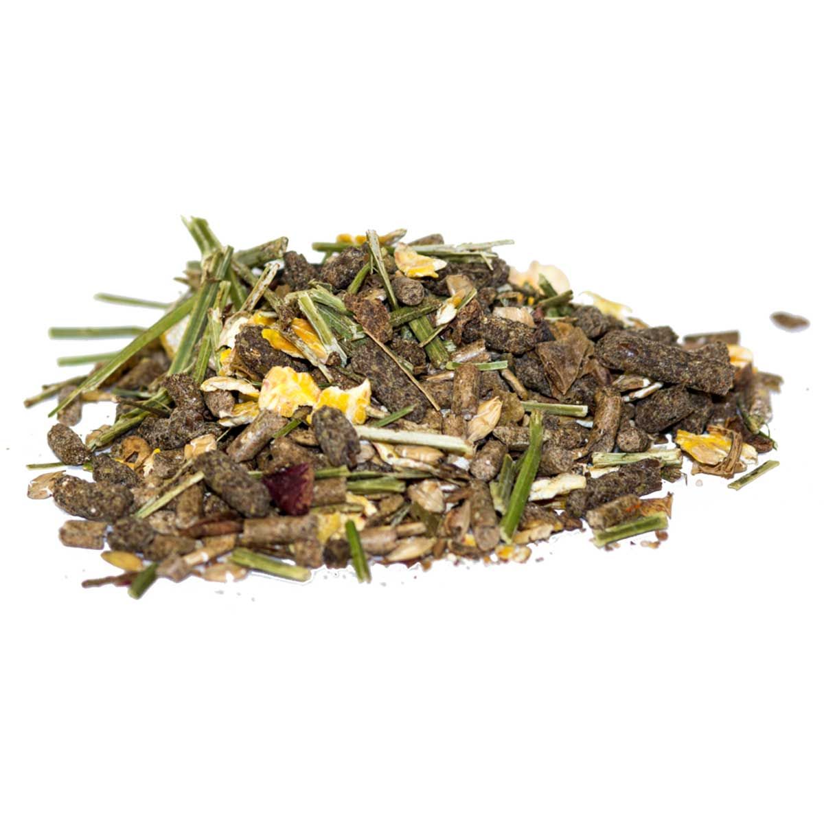 Flocons d'orge, flocons de maïs, son de blé, marc de pomme, graines de lin extrudées, tourteau d'extraction de lin, orge laminée, germes de maïs, son de blé, pulpe de betterave séchée mélassée, mélasse de betterave sucrière, levure de bière, luzerne hachée, orge, avoine, carbonate de calcium, herbe hachée séchée à chaud, lignocellulose, blé, chlorure de sodium, phosphate monocalcique, bicarbonate de sodium, levure de bière, oxyde de magnésium, parois cellulaires de levure séchées par pulvérisation (MOS-ß-glucanes)