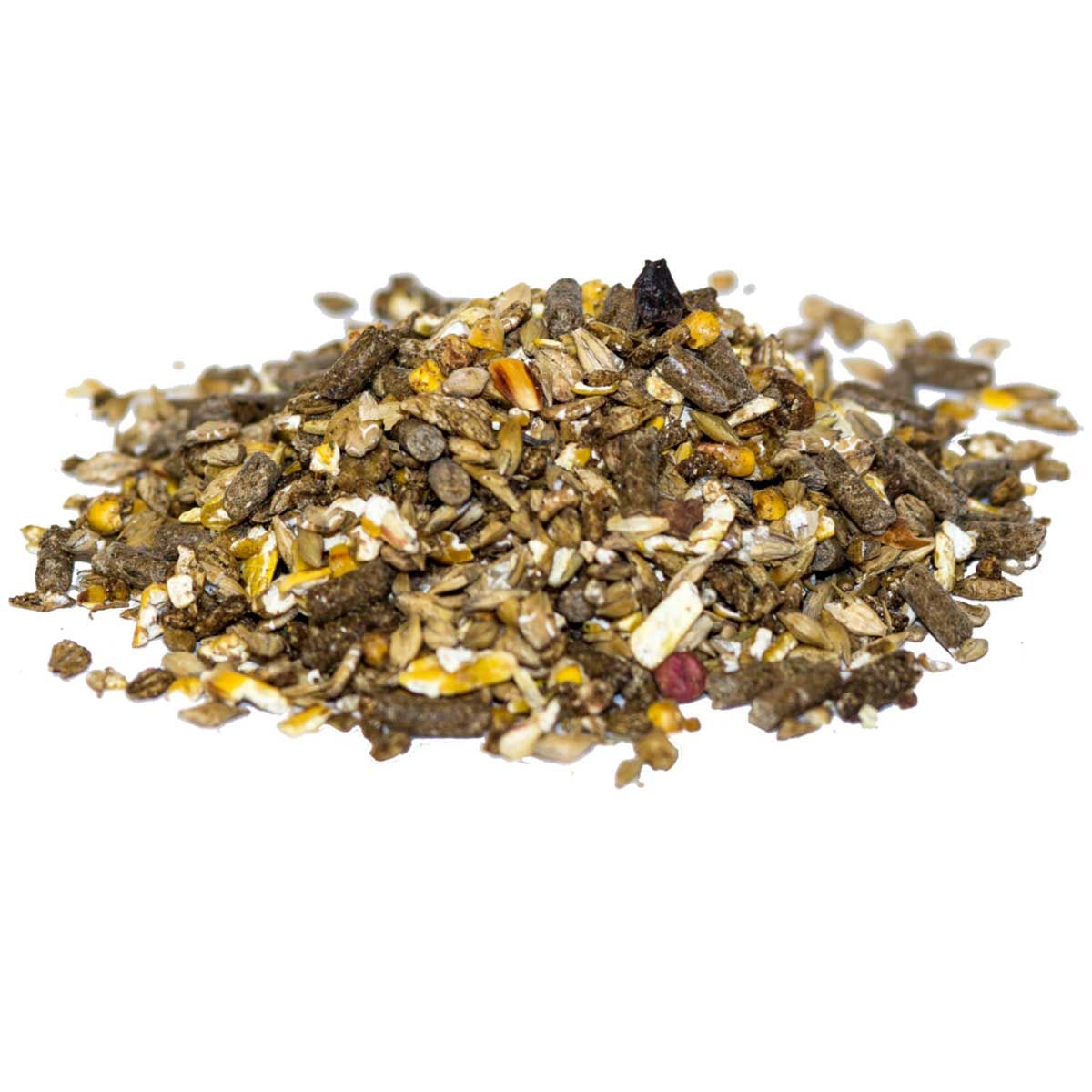 Orge (orge laminée, flocons d'orge), maïs (maïs laminé, flocons de maïs), son de blé, mélasse de betterave sucrière, pulpe de betterave sucrière séchée mélassée, marc de pomme, tourteau d'extraction de lin, carbonate de calcium, herbe hachée séchée à chaud, lignocellulose, germes de maïs, chlorure de sodium, levure de bière, bicarbonate de sodium, oxyde de magnésium, phosphate monocalcique.