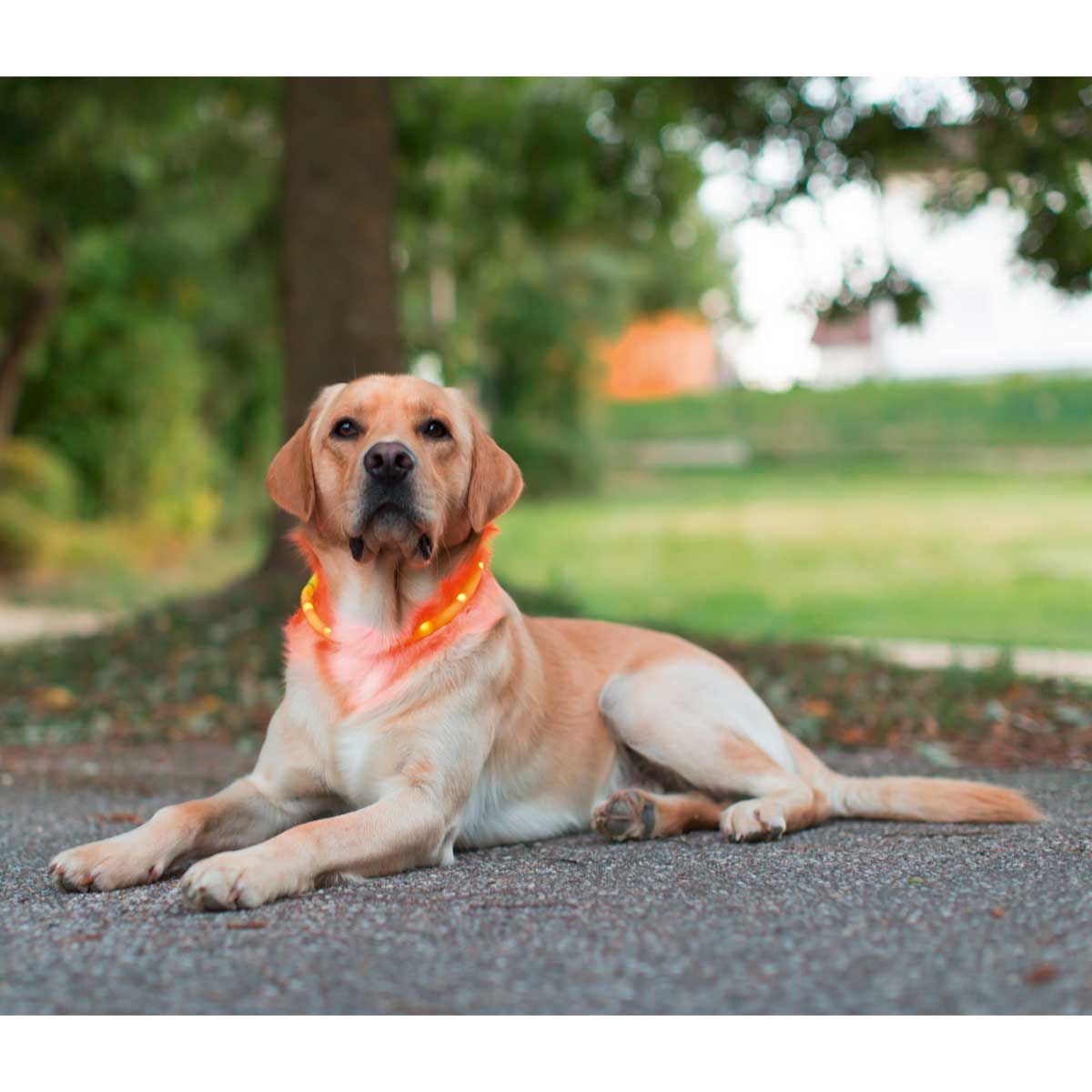 Le collier led peut être raccourci individuellement, il est résistant à l'eau et visible jusqu'à 500 mètres. On peut choisir entre deux niveaux de clignotement ou une lumière continue. Une batterie rechargeable peut être rechargée via le câble usb inclus.