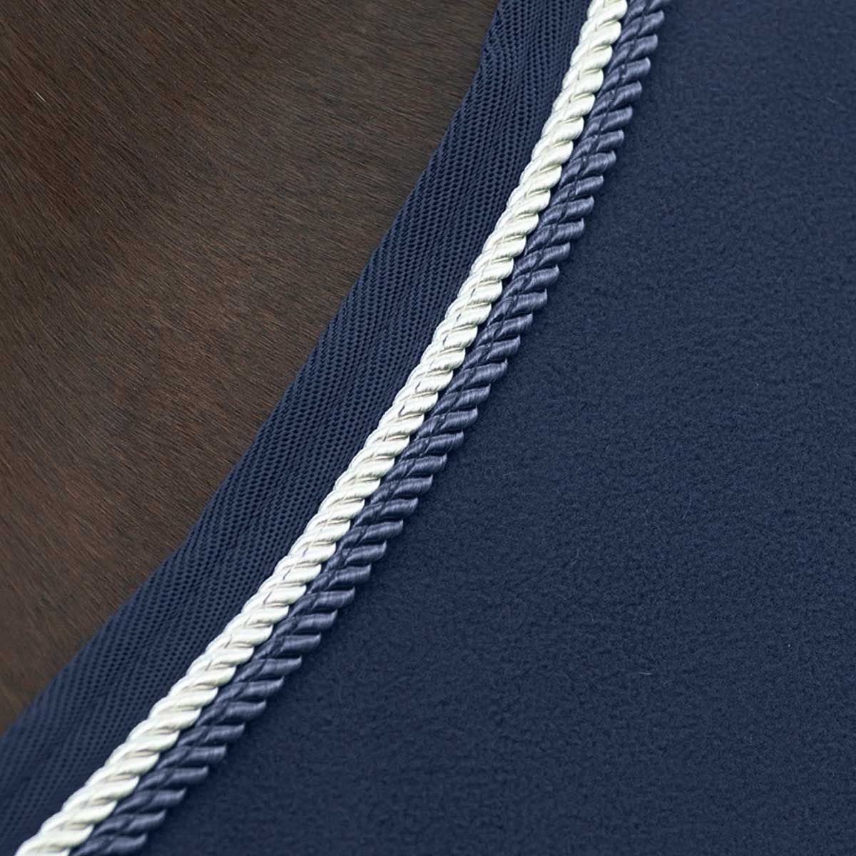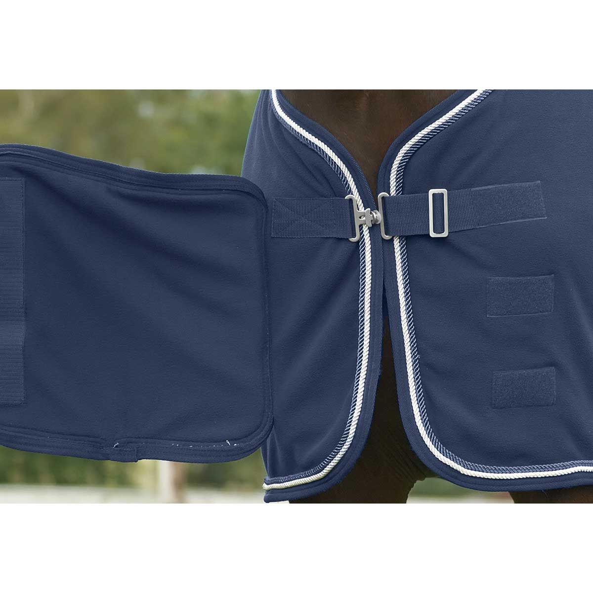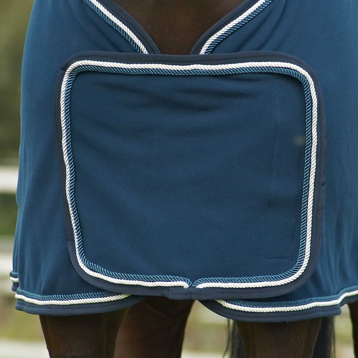 L'élégante parade de couvertures pour chevaux de la maison est BUSSEfaite d'un tissu polaire lourd et de haute qualité. L'agréable tissu gaufré en coton dans la zone de la poitrine, la couture centrale dans le dos et la généreuse profondeur des côtés rendent le tapis particulièrement confortable à porter. Un doux coussinet de garrot et la profonde cordelette de revers donnent la touche finale à la couverture pour chevaux. L'élégante double cordelette en blanc et marine et la bavette, idéale pour la broderie, font de la couverture un véritable accroche-regard.