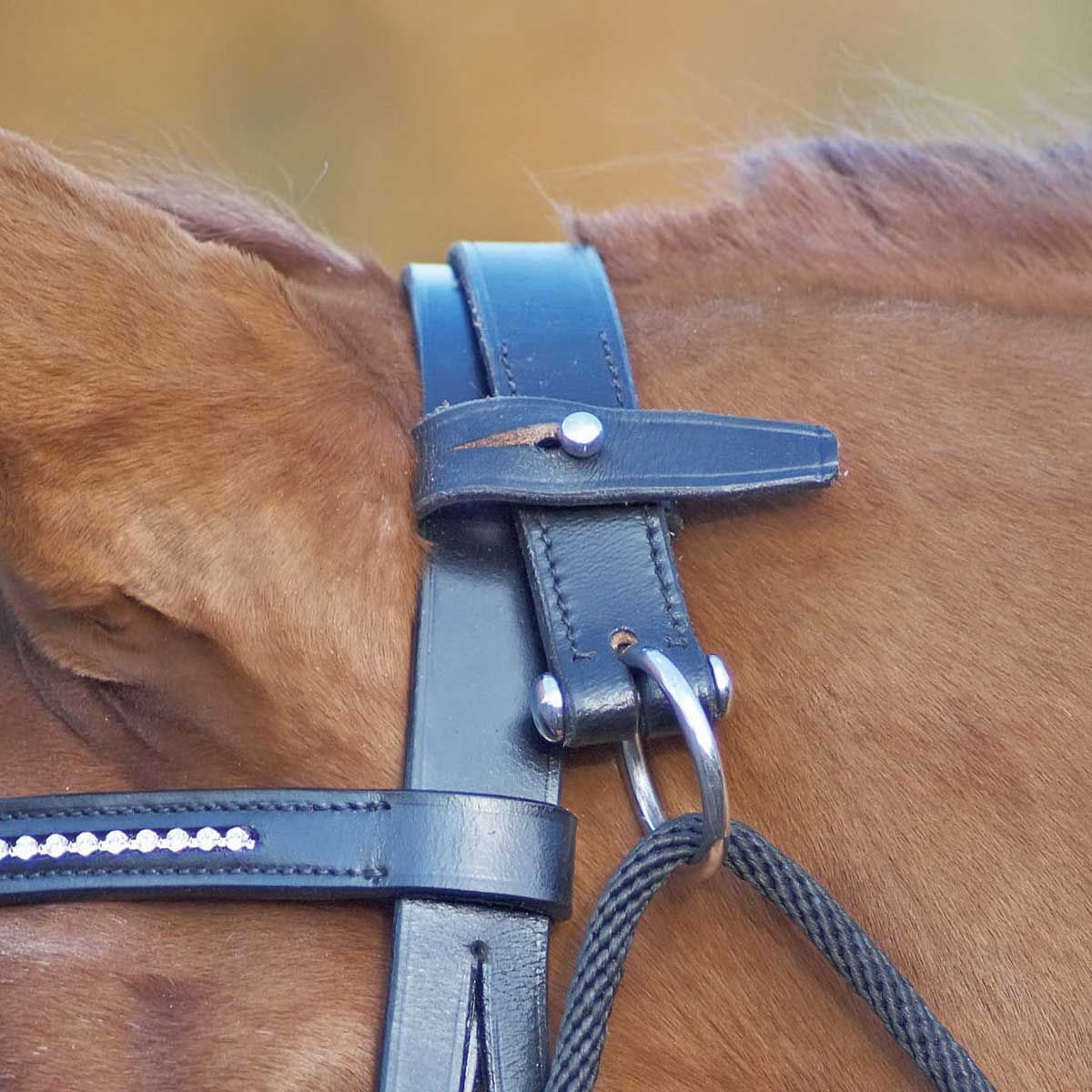 - composé d'une pièce de base réglable en longueur, d'une pièce de tête et d'un cordon continu avec des mousquetons pour l'accrochage dans les anneaux de mors