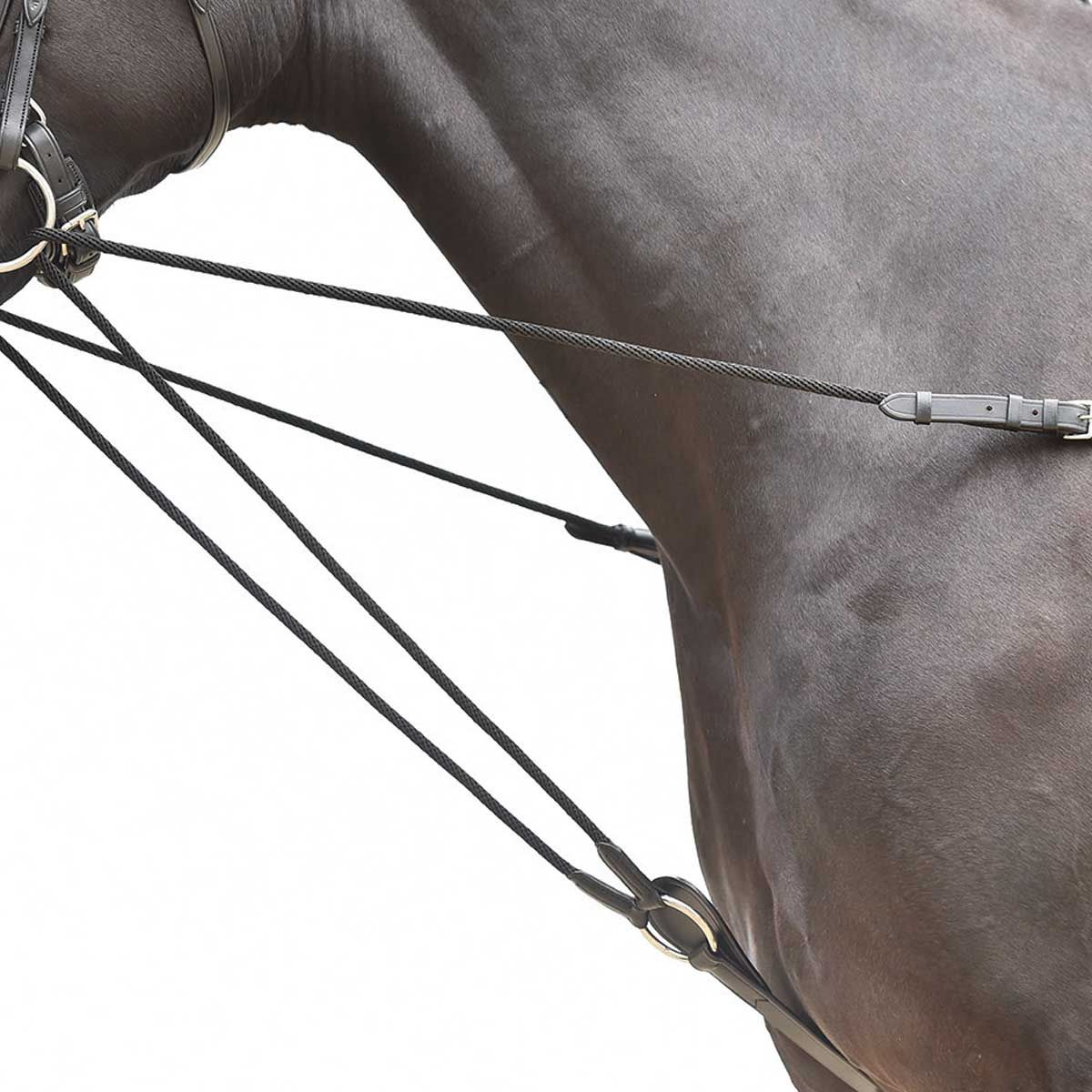 Lors du choix des rênes auxiliaires, il est important de choisir la bonne taille pour le cheval. Un ajustement final peut être effectué directement sur le produit pour garantir un ajustement optimal des rênes auxiliaires. Assurez-vous que les rênes auxiliaires sont correctement bouclées.