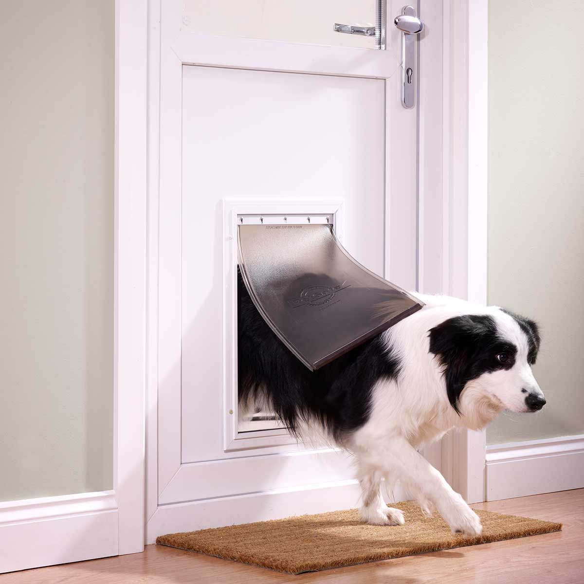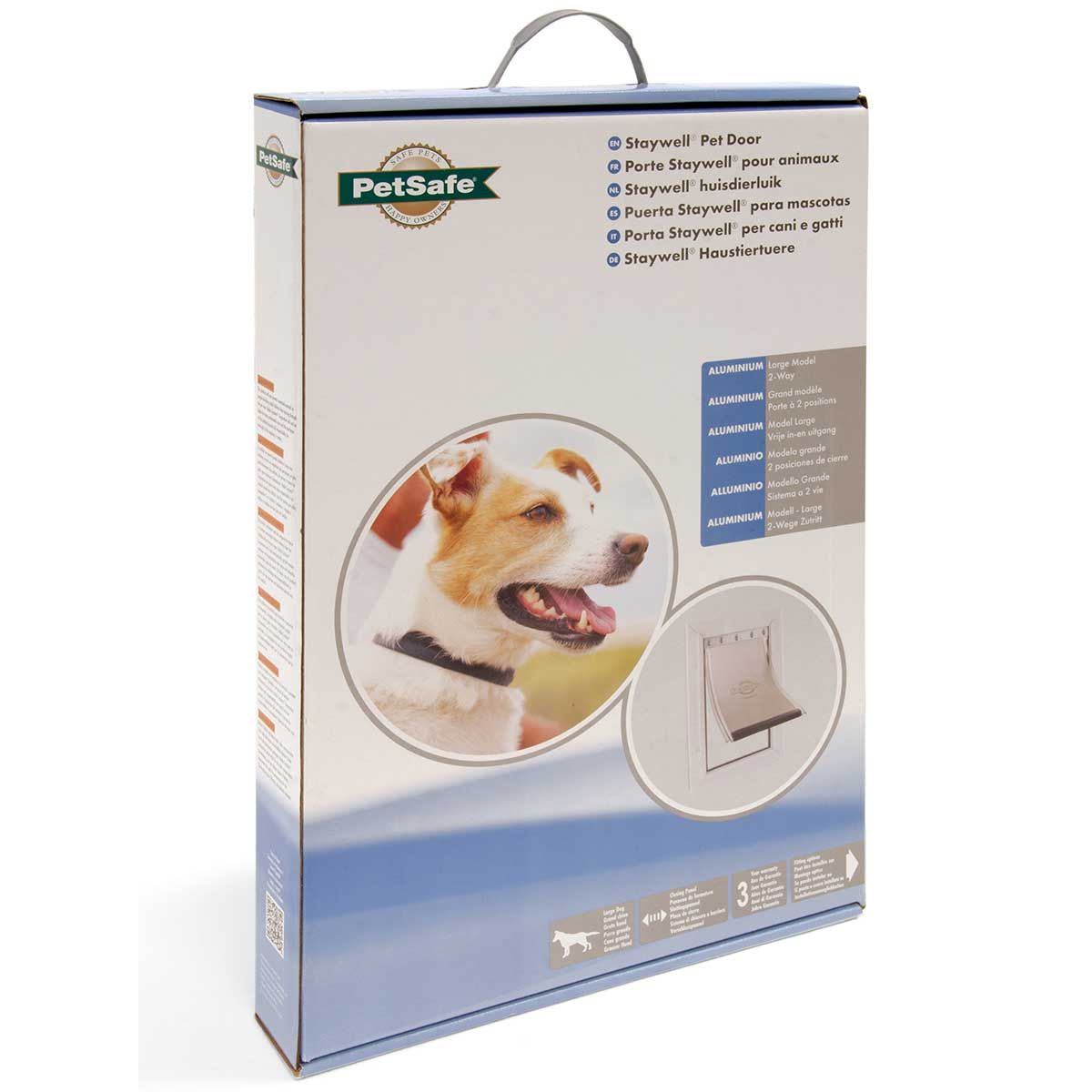 La trappe pour chien originale PetSafe Staywell 640 avec un clapet transparent fixe, porte verrouillable de l'intérieur, joint magnétique, instructions de montage incluses, vis incluses.