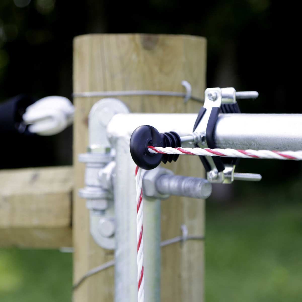Avec le kit électrique, votre porte de pâturage peut être facilement électrifiée et connectée à une clôture de pâturage existante. Cela garantit une sécurité maximale des troupeaux.