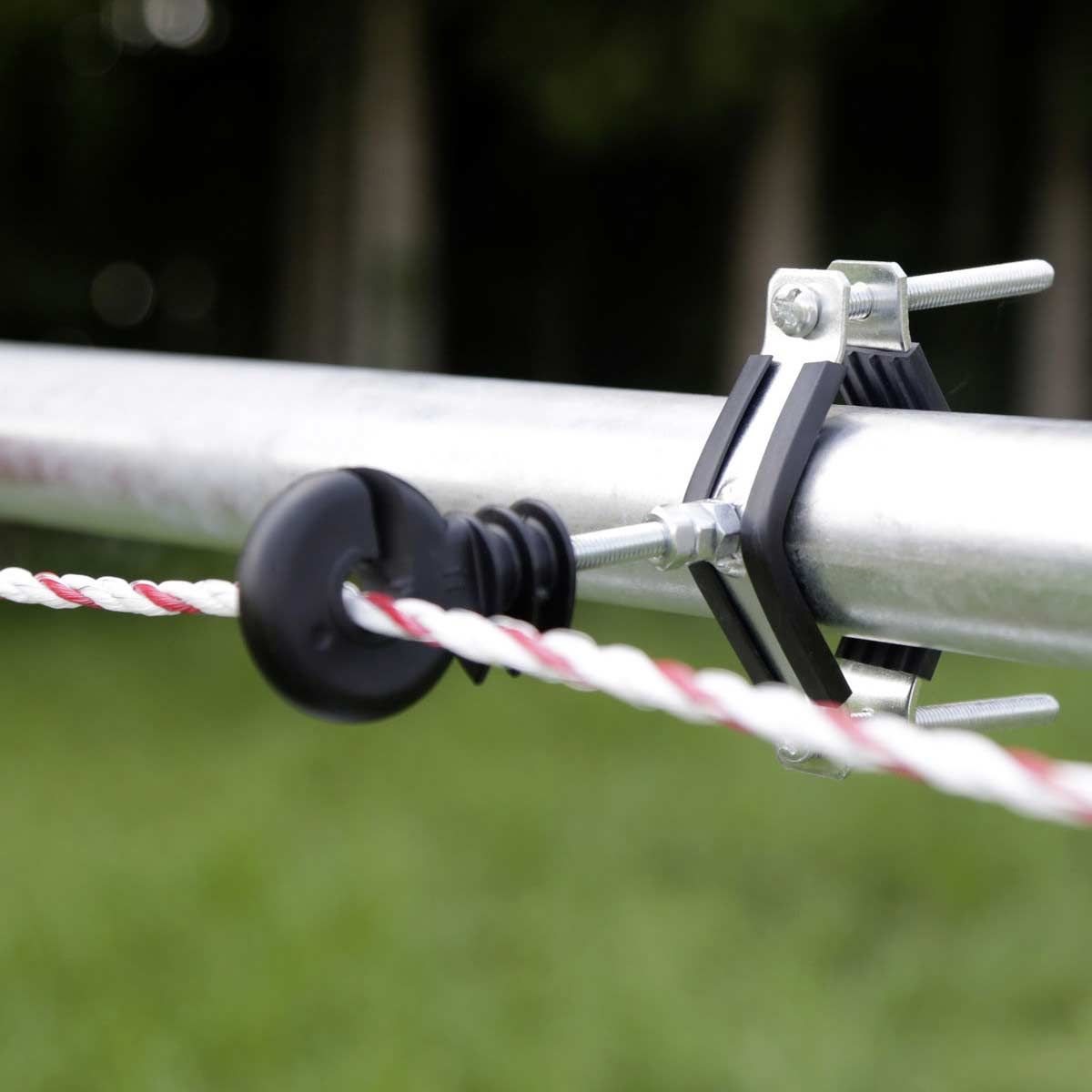 Avec cet appareil électrique, vous pouvez électrifier votre système de clôture dans la zone de la porte du pâturage. La corde de clôture électrique est simplement fixée au cadre du portail à l'aide des clips métalliques et des isolateurs fournis. La ré-électrification empêche les animaux d'entrer en contact avec le portail et de l'endommager éventuellement. Malgré l'électrification, la porte peut toujours être ouverte et fermée à la main et le propriétaire du bétail n'a pas à s'en soucier. Pour un maximum de sécurité, l'appareil électrique doit être utilisé avec un portail de clôture. Aucune autre clôture n'offre un niveau de sécurité aussi élevé.