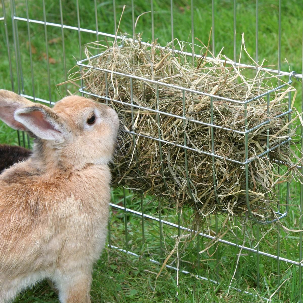 Le râtelier pour rongeurs est dentelé et convient parfaitement pour le foin, la salade ou d'autres friandises. Le distributeur de nourriture peut être accroché au grillage de la cage.