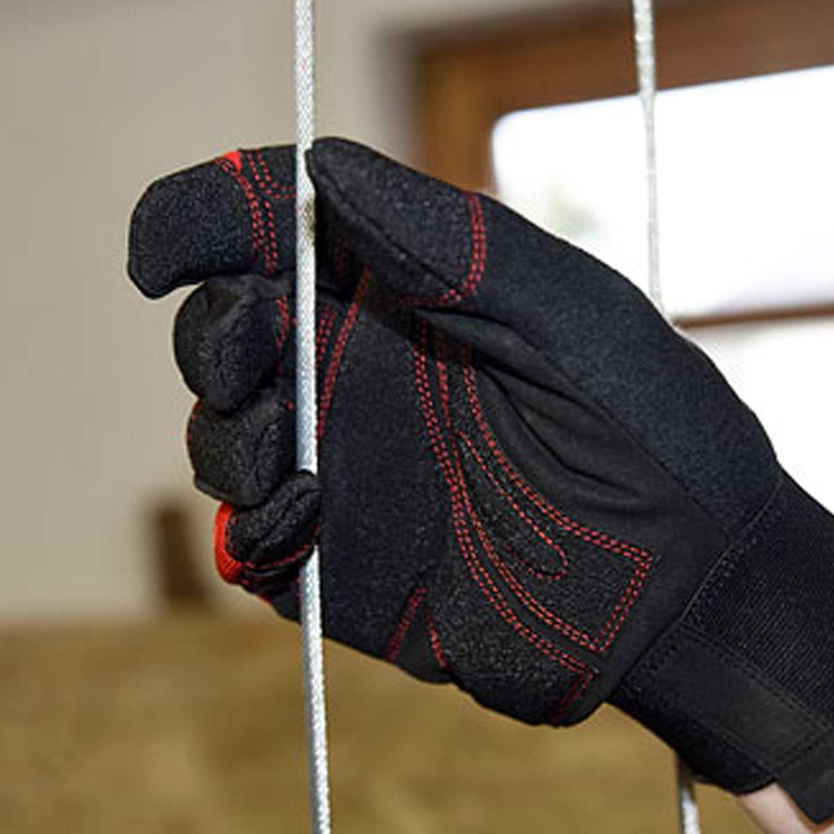 - Avec des surfaces en pvc doublement renforcées et rugueuses pour les mains et les doigts, pour une excellente durabilité et une bonne prise en main, également adaptée au travail avec des cordes