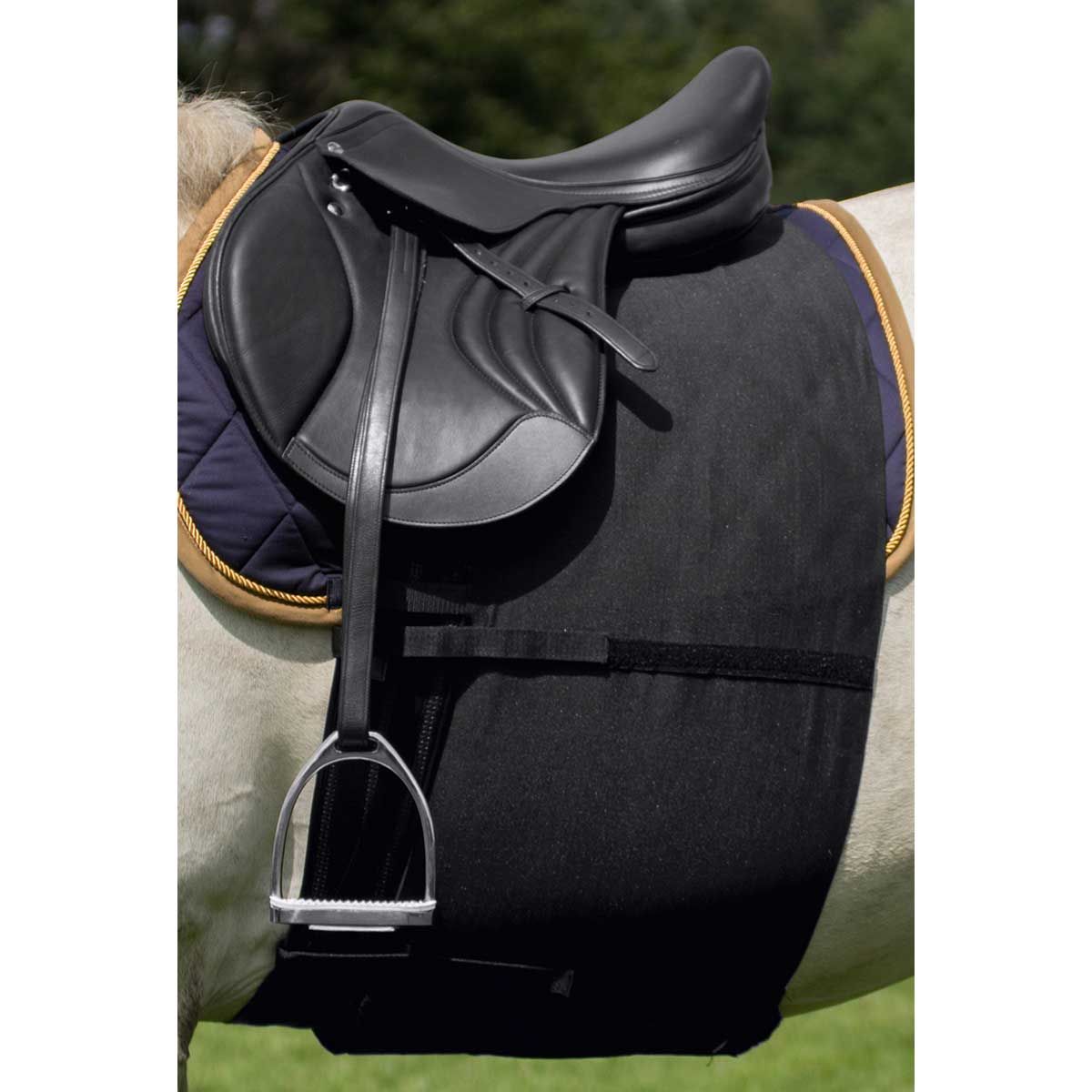 - peut être fixé en le plaçant directement sur le dos du cheval ou entre le tapis de selle et la selle