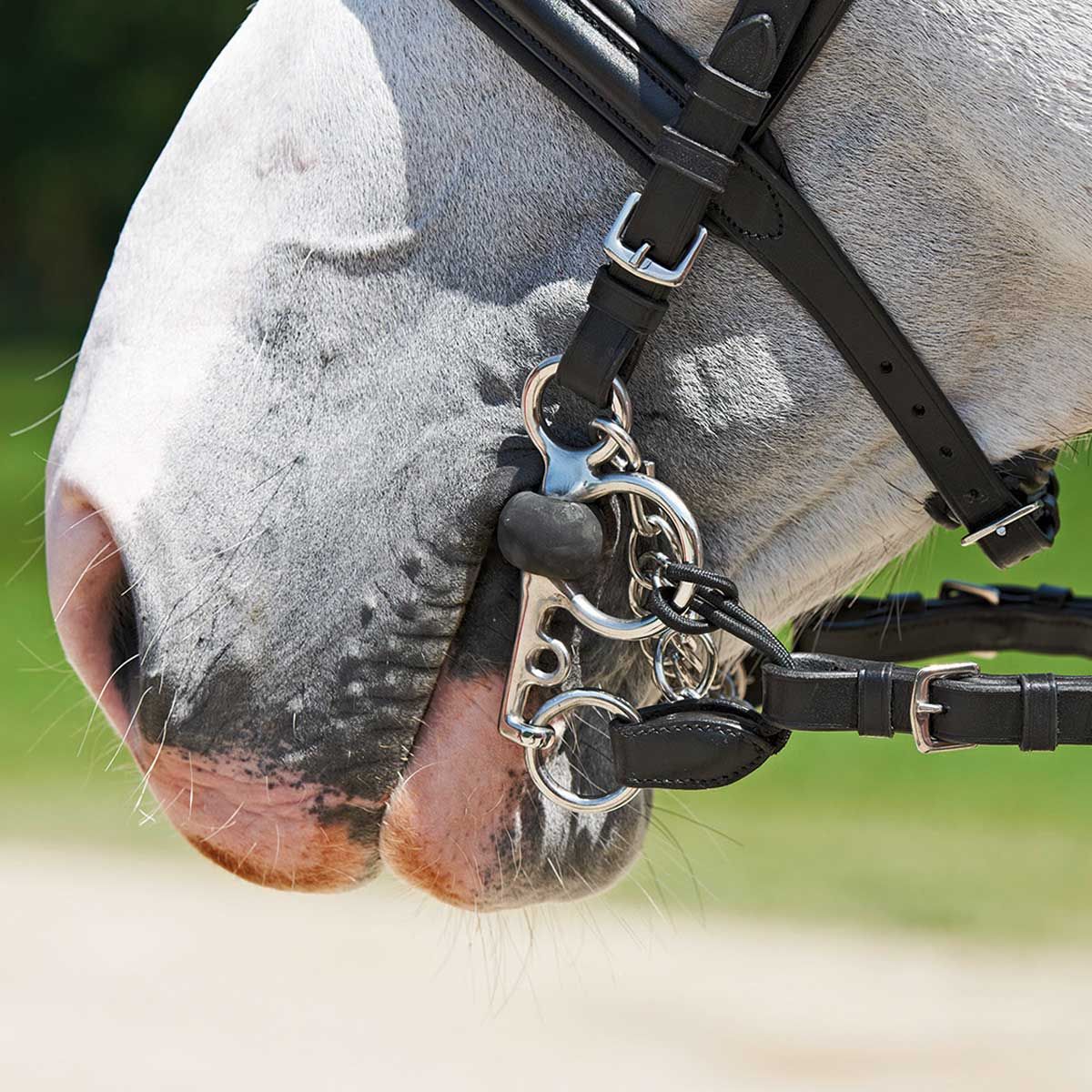 Le foret doit être vérifié régulièrement pour détecter tout signe d'usure, tel que des arêtes vives, et remplacé si nécessaire. Veuillez n'utiliser le mors que s'il est dans un état approprié qui ne nuit pas au bien-être du cheval.