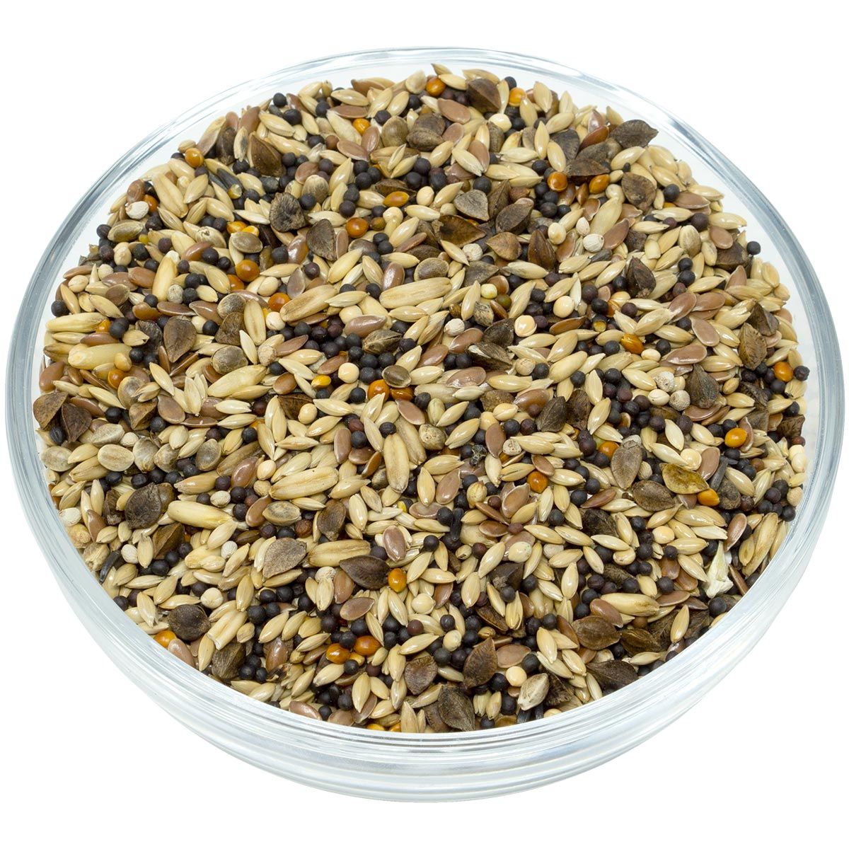 Composition: 36,00 % de graines de lys, 21,00 % de navette noire, 14,00 % de graines de lin, 8,00 % de sarrasin, 6,00 % d'avoine roulée, 5,00 % de millet jaune, 5,00 % de millet rouge, 3,00 % de chanvre européen, 1,00 % de graines de nègre, 1,00 % de graines de périlla blanche.