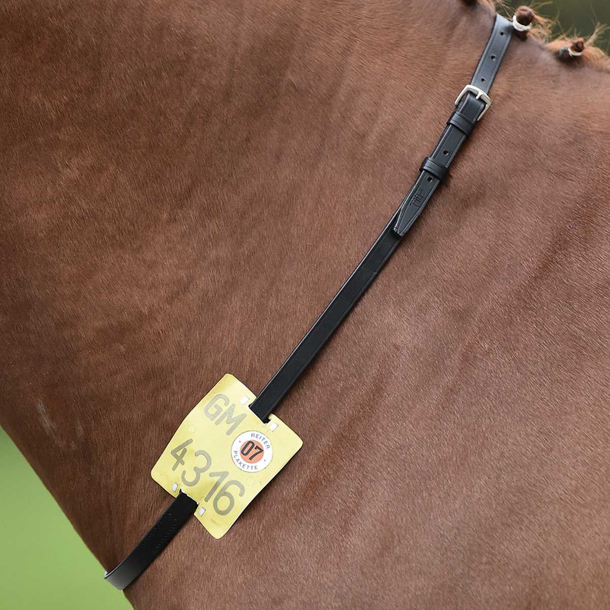 La plaque d'identification est un tour de cou en cuir dont la circonférence est réglable. Pour la fixation d'une plaque d'immatriculation équestre des deux côtés, qui dans certains États fédéraux doit être fixée lors de la conduite.