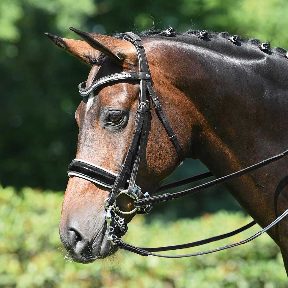 - composé d'une têtière, de pommettes, d'un bandeau frontal et d'une courroie de gorge innovants pour un choix individuel de muserolle