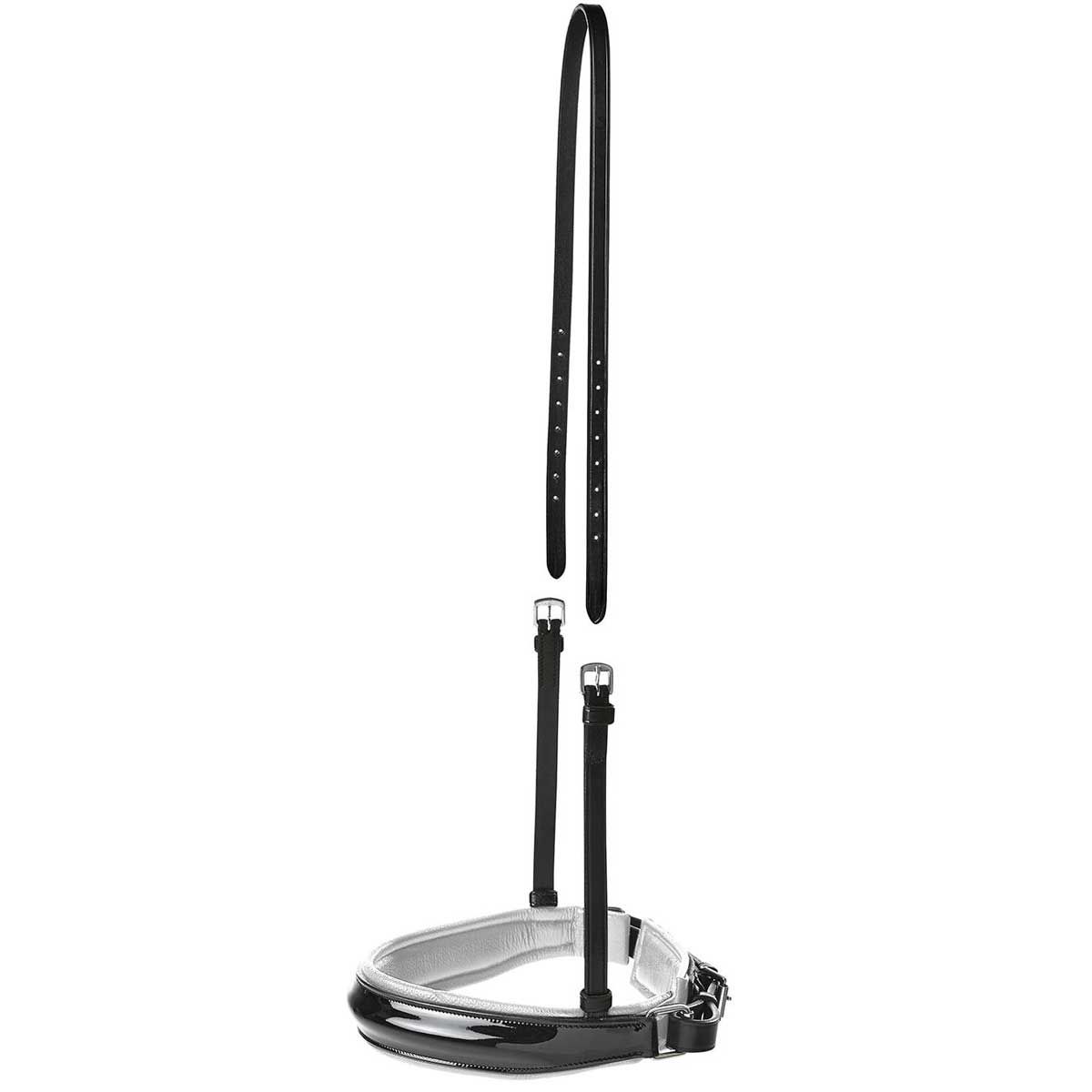 - Muserolle suédoise avec un rétrécissement latéral et une muserolle extra-large, souple et rembourrée, avec une surface en cuir verni, des boucles à rouleaux et un protège-mâchoire intégré