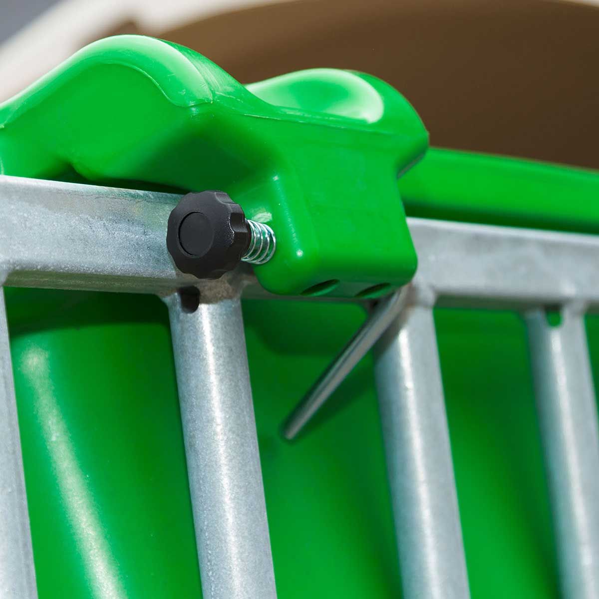 Les 5 super-tétines éprouvées avec vannes à vis conviennent à tous les veaux. Grâce à la fermeture à charnière facile à actionner, le biberon est solidement fixé aux murs de l'étable, aux cornadis, aux clôtures et aux tuyaux jusqu'à un ø max. de 61 mm (2"). Les coins arrondis facilitent le nettoyage. L'abreuvoir pour veaux est empilable et peut être facilement transporté.