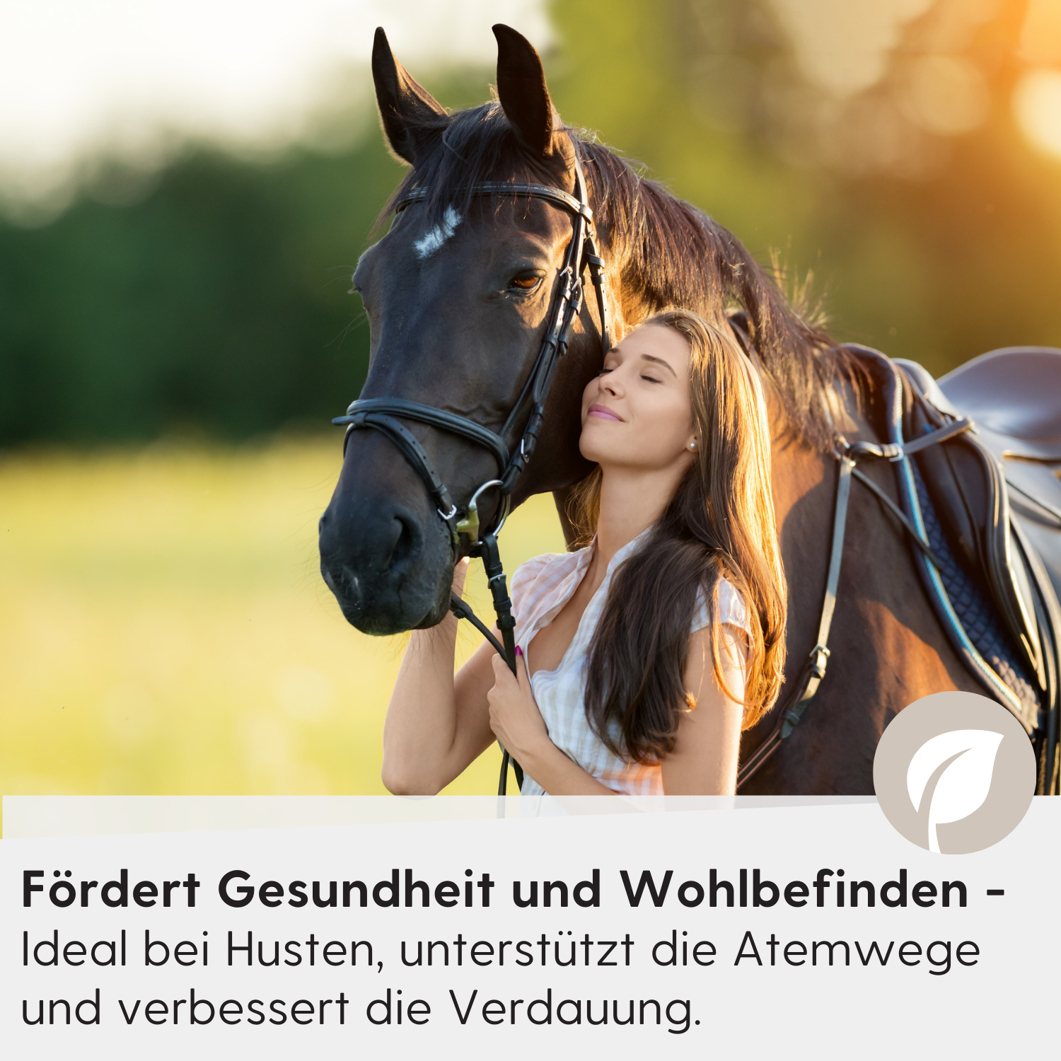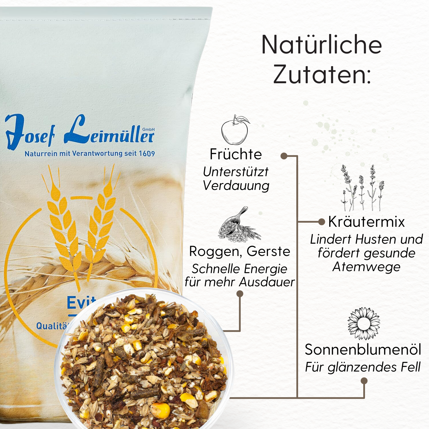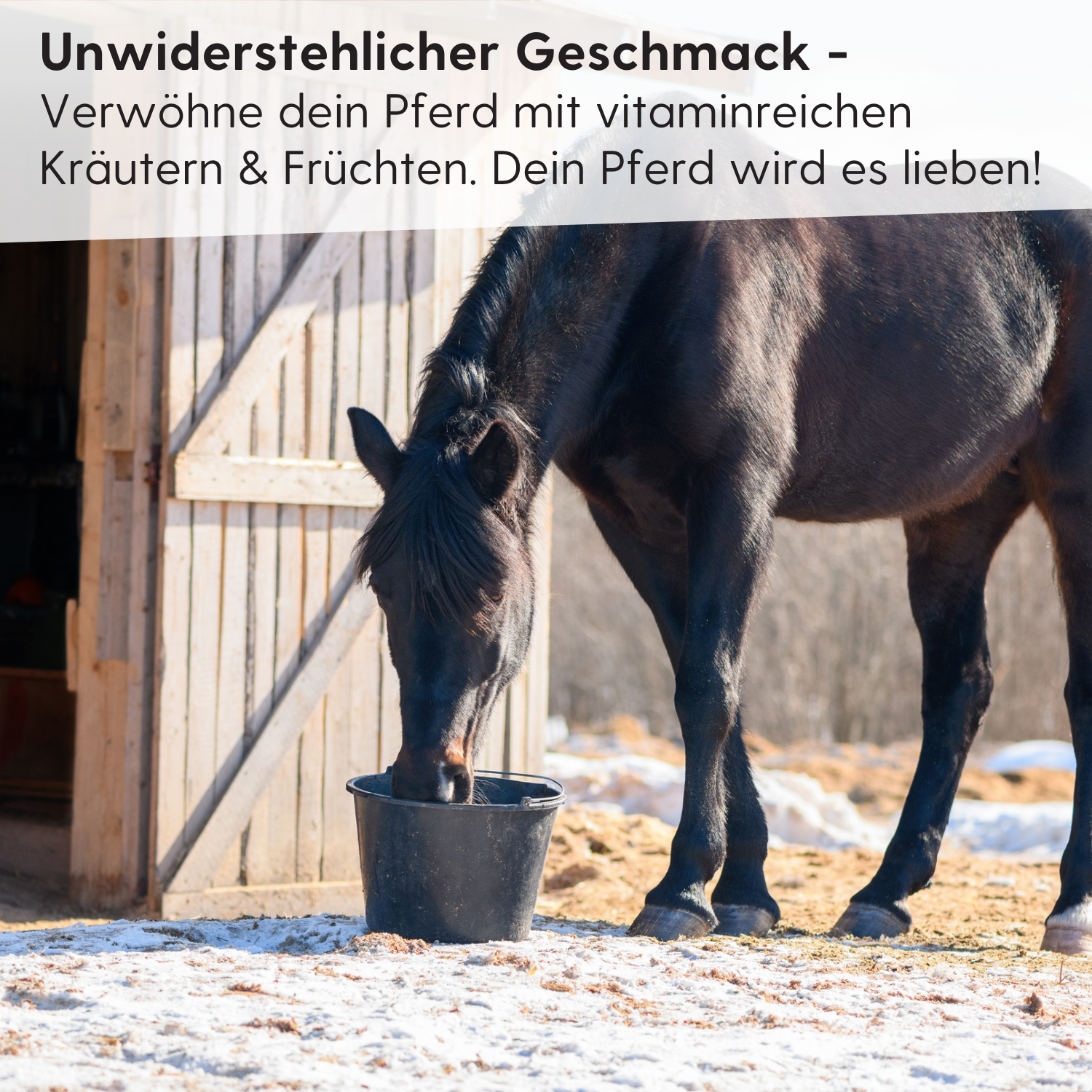 l'alimentation des chevaux de Leimüller à base d'herbes est très digeste, bonne pour les voies respiratoires et contre la toux. L'aliment composé des meilleures matières premières avec du marc de pomme séché, divers fruits et des herbes naturelles a un goût excellent pour les chevaux.