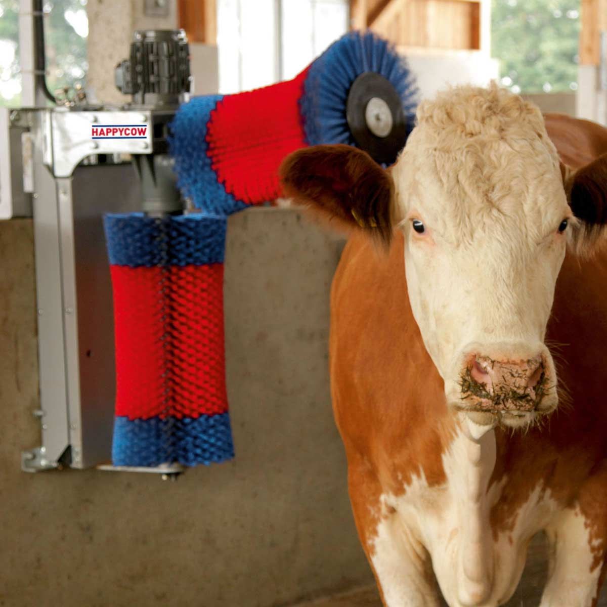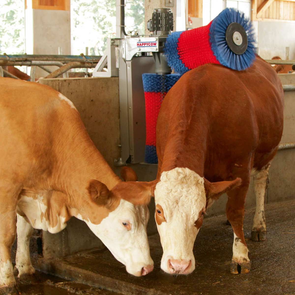 Avec la brosse à vaches automatique HAPPYCOW Duo, les vaches se nettoient volontiers, spontanément et de manière totalement autonome. Les animaux se sentent parfaitement à l'aise avec la machine à 2 brosses et il est intéressant de voir comment ils se laissent brosser et masser avec plaisir. Le brossage et le massage favorisent la circulation sanguine dans la peau et stimulent le métabolisme. Ils améliorent la production de lait et augmentent la fertilité.