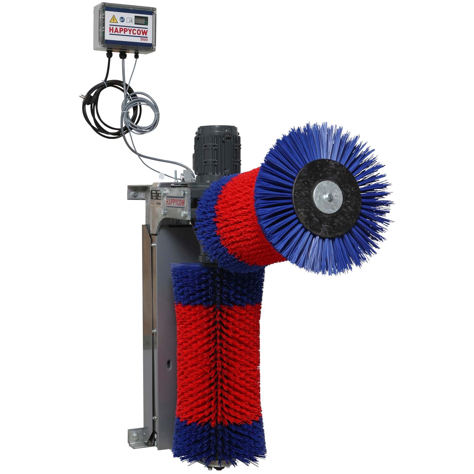 Les poils en polyamide de haute qualité garantissent une longue durée de vie et l'électronique innovante assure un fonctionnement sans heurts et nécessitant peu d'entretien. L'action combinée des deux brosses permet de nettoyer efficacement la tête, le cou, le dos, le tronc et le flanc de la vache. Les brosses à vaches HAPPYCOW Duo sont équipées d'une unité de commande flexible dans un boîtier étanche aux éclaboussures et à la poussière (IP 56). Un écran d'information toujours actualisé indique l'état de fonctionnement. La durée de fonctionnement de la brosse peut être réglée de manière variable (7,5 - 120 s). Grâce au sens de rotation alterné des brosses après chaque activation (60 s), l'usure des poils est régulière. Le confort de l'animal est également assuré par la force de contact optimisée des brosses. La lubrification permanente est assurée pendant toute la durée de vie de la mécanique. Les brosses pour bétail HAPPYCOW Duo sont prêtes à être branchées sur une prise normale de 230 volts et sont équipées d'un système d'arrêt de sécurité (en fonction du couple).