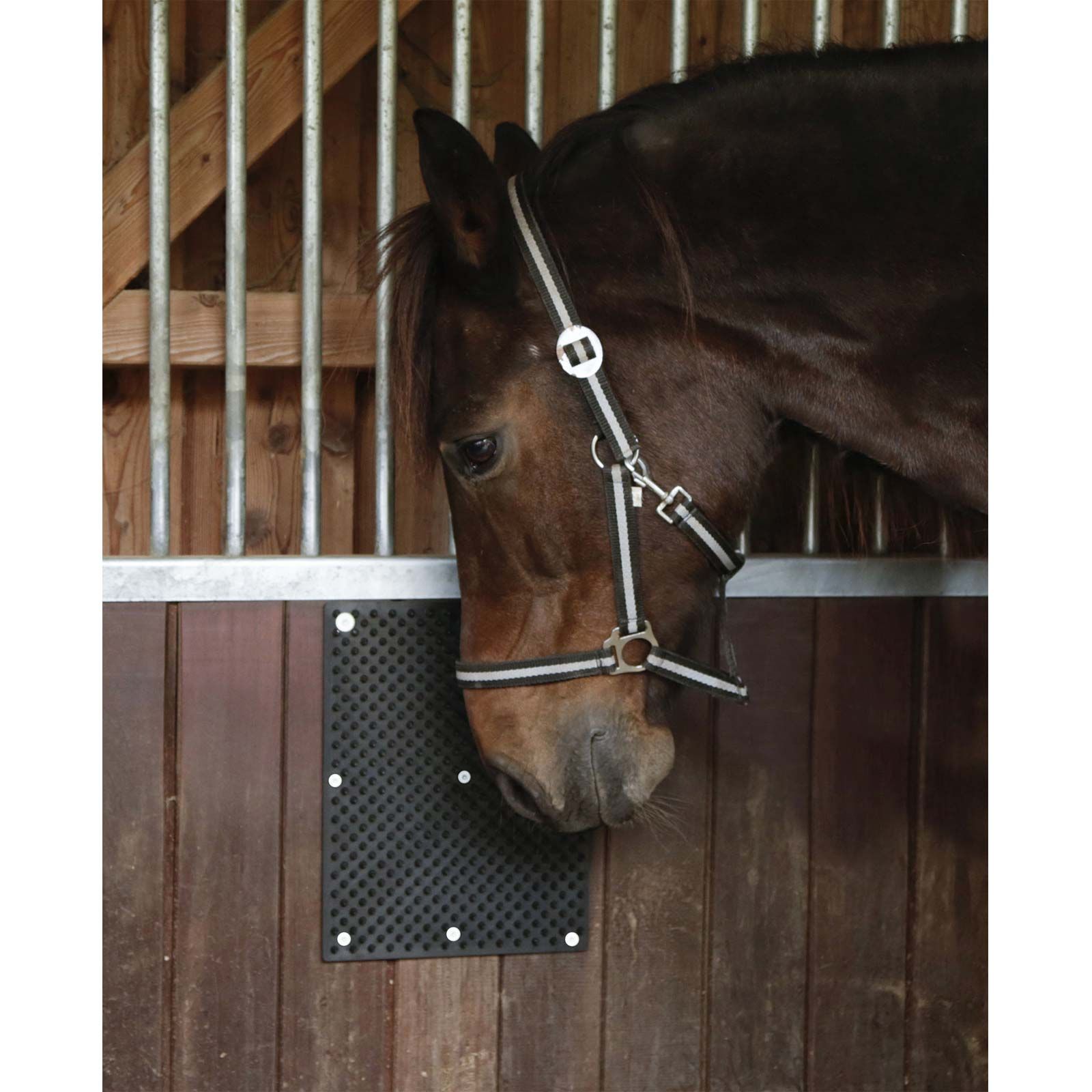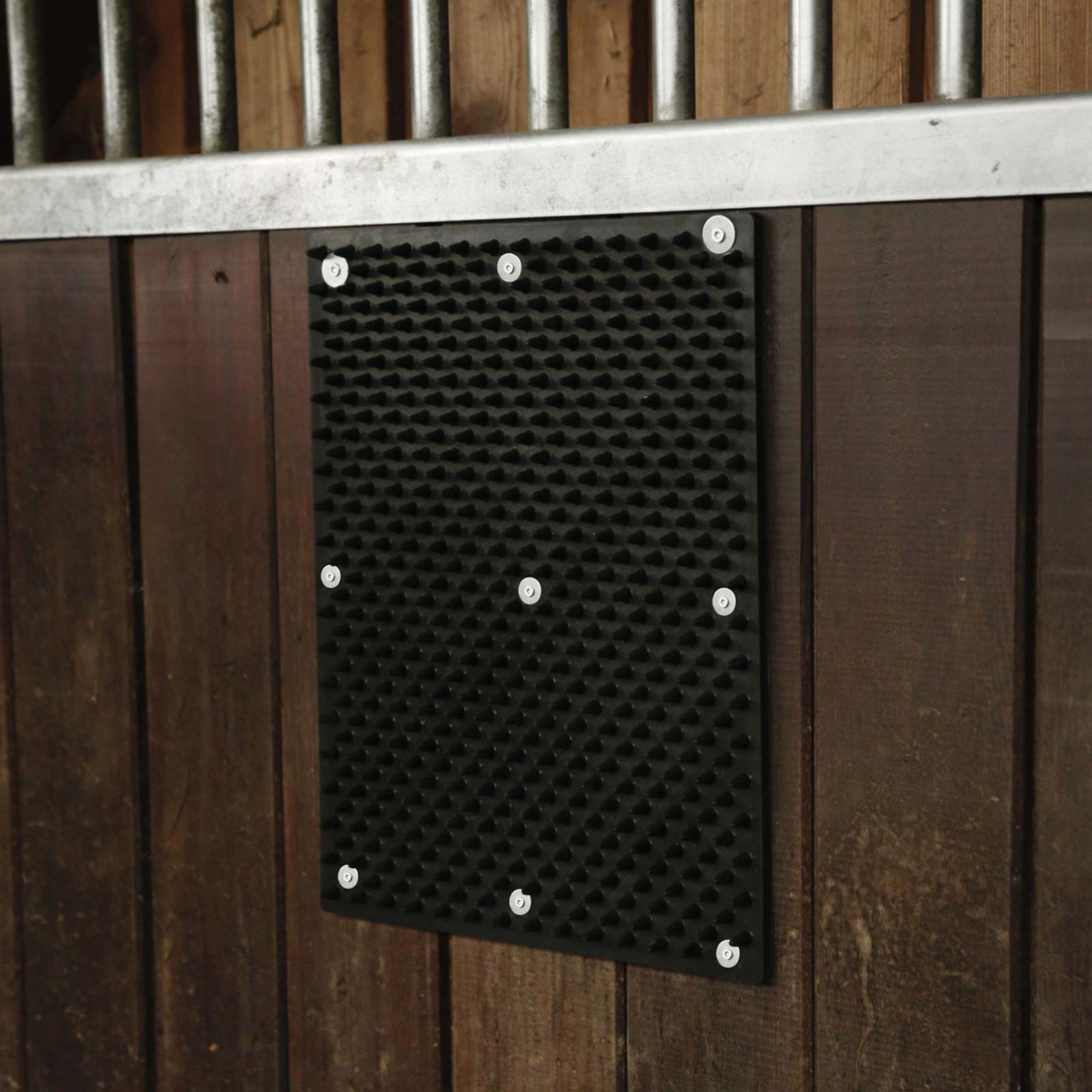 Une forme rectangulaire avec de nombreux trous de fixation assure une fixation stable sur les boxes des chevaux, les murs ou les poteaux. Possibilités d'application multifonctionnelles, par exemple à plat sur le mur ou autour de colonnes, de poteaux ou de coins. Ce tapis à gratter convient également très bien à d'autres espèces animales ayant un besoin naturel de se gratter, comme les chèvres.