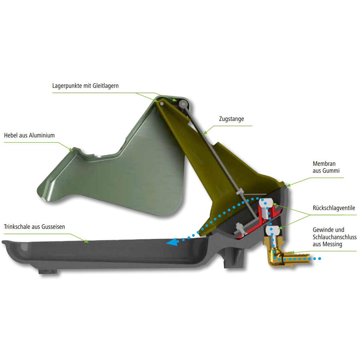 Le levier est poussé vers l'avant par la tête de l'animal. La tige de traction soulève la membrane et aspire l'eau dans l'espace de la membrane. En raison de la gravité et de la tension dans la membrane, le levier se déplace à nouveau vers l'arrière. L'eau est déplacée de l'espace de la membrane et s'écoule dans le bol à boire. Les clapets anti-retour garantissent que l'eau est toujours aspirée et pompée dans le bon sens. Une partie de l'eau pompée reste sur le dessus de la membrane et s'écoule dans l'abreuvoir dès que la membrane est à nouveau activée au cours du cycle suivant, c'est-à-dire lorsque l'animal pousse à nouveau le levier (fonction de double course).