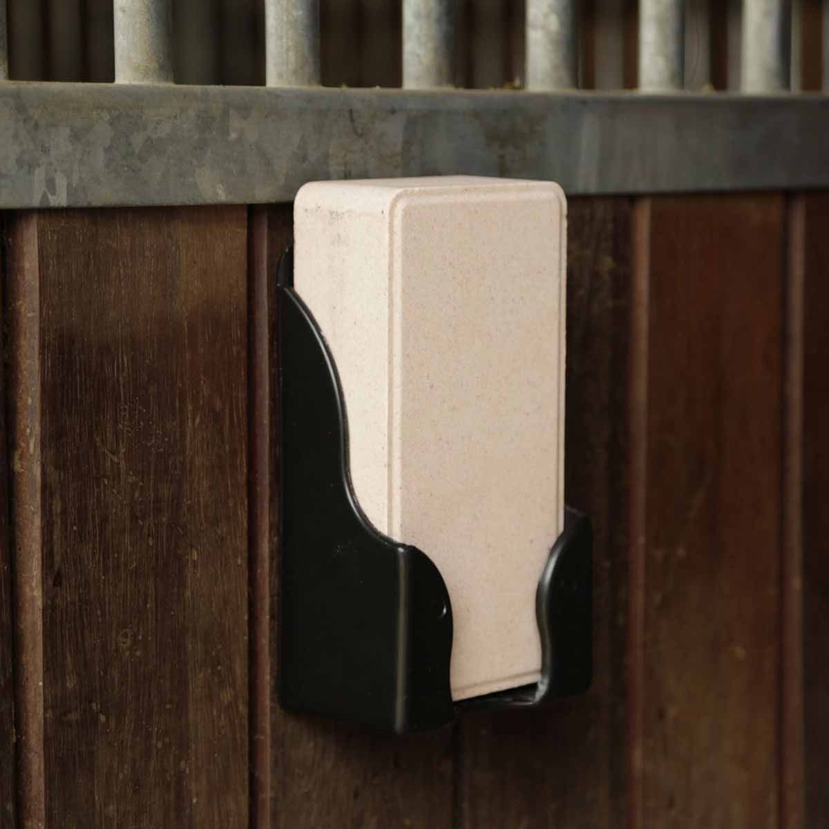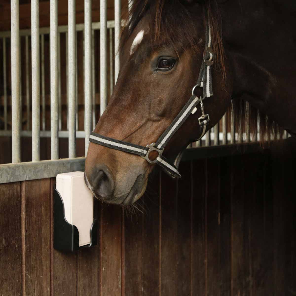 Dans le meilleur des cas, la pierre à lécher salée est installée à proximité de la mangeoire avec le support de pierre à lécher adapté. Le cheval a alors la possibilité de s'approvisionner en sodium manquant en fonction de ses besoins.