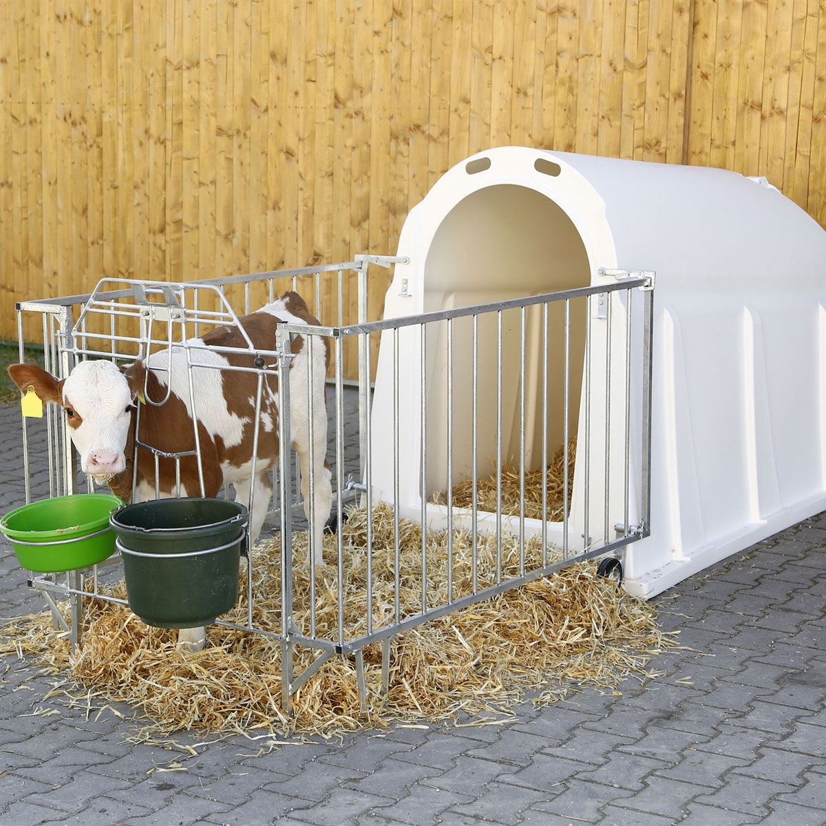CalfHouse pe avec une clôture lumineuse et une protection supplémentaire contre les UV. Fou un haut degré de stabilité et de durabilité est assuré par l'utilisation de plastique HDpe de haute qualité, résistant aux chocs et doté de stabilisateurs UV intégrés. La climatisation optimale du clapier à veaux est assurée par le volet d'aération, qui peut être réglé en plusieurs étapes et verrouillé fermement à toutes les étapes. Il facilite également le remplissage du râtelier à foin. Les surfaces intérieures particulièrement lisses font du nettoyage un jeu d'enfant et améliorent ainsi l'hygiène. Une poignée permettant de soulever le clapier à veaux est intégrée dans la forme du clapier.