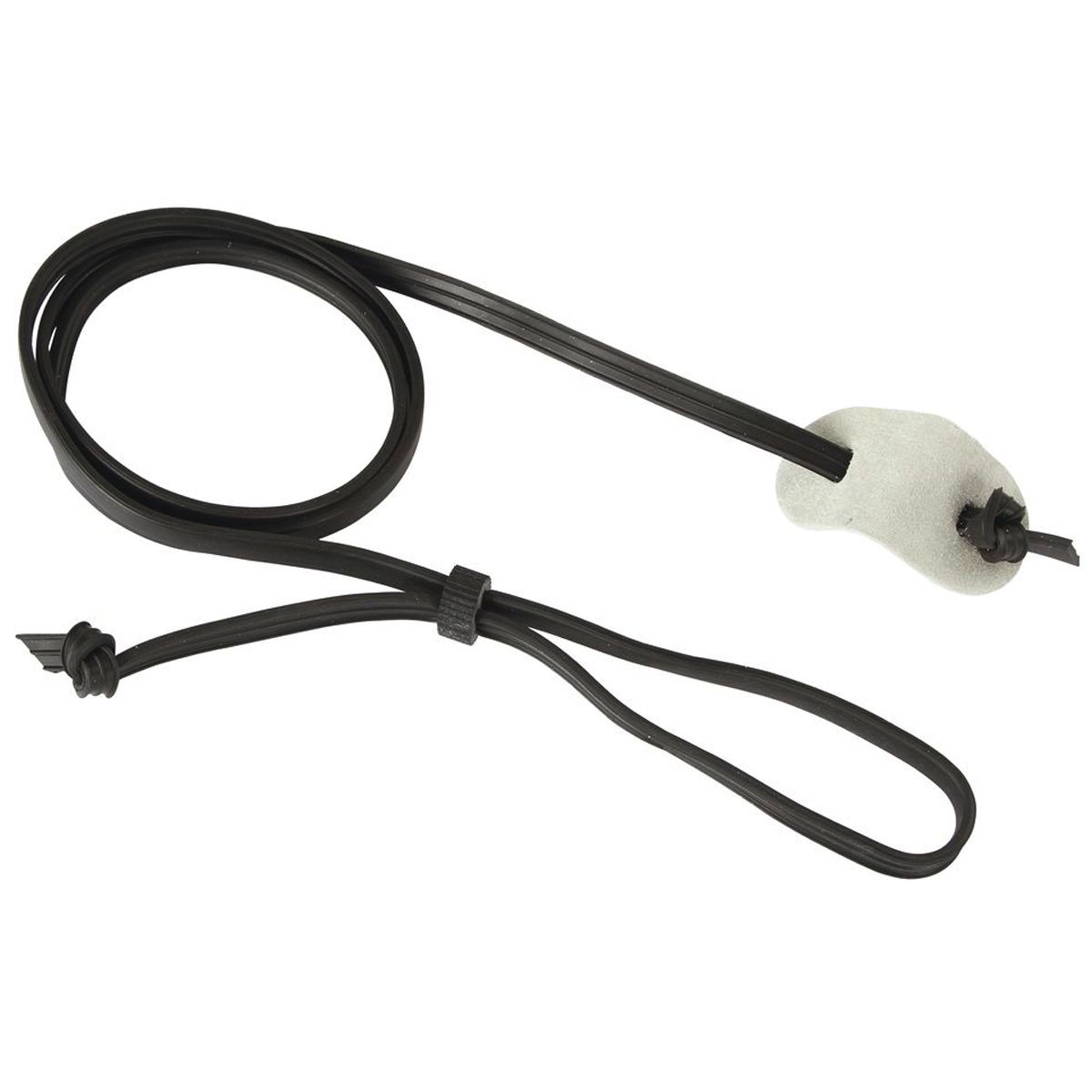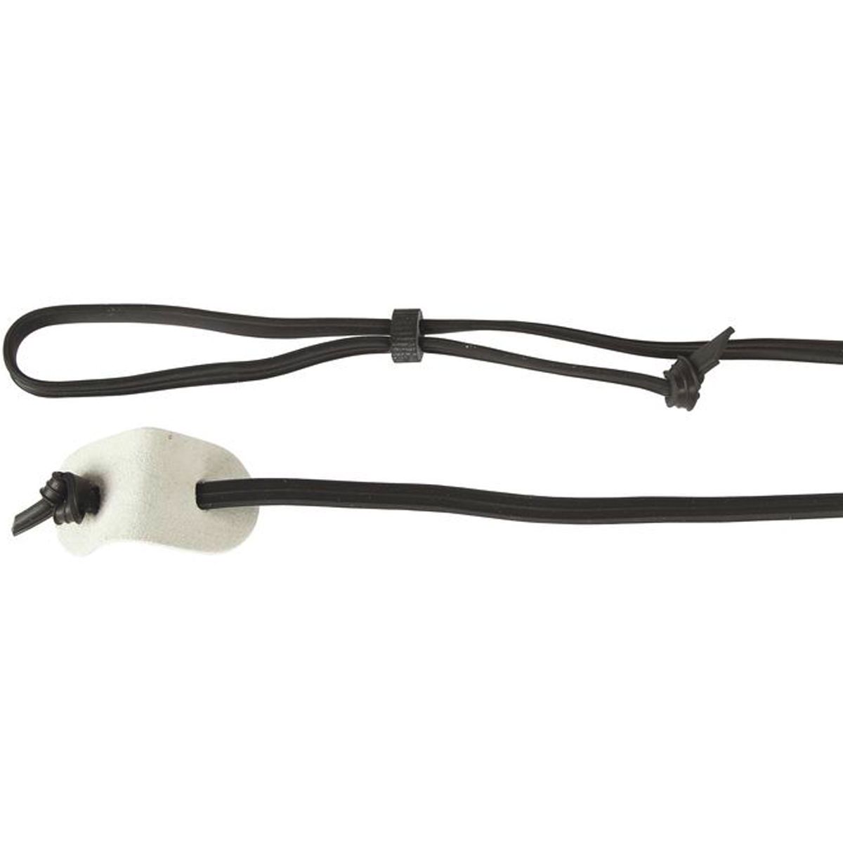 Au moyen d'un support supérieur métallique, le caoutchouc supérieur est relié au cordon de caoutchouc. Le cordon en caoutchouc sert de protection contre les surcharges et se détache du support supérieur en cas de tension excessive. Au moyen d'un cordon en Perlon, qui est relié au cordon en caoutchouc, la queue de la vache peut être suspendue plus haut si nécessaire (par exemple pendant la traite). À l'extrémité inférieure se trouve l'attache rapide pour la queue de la vache. Il se compose d'une goupille de verrouillage et d'un caoutchouc de fond.