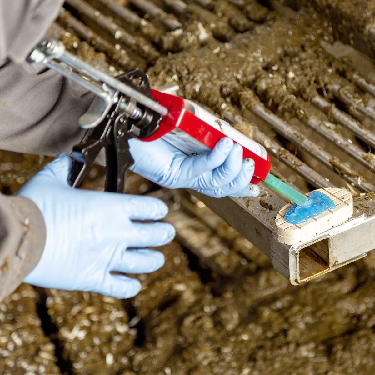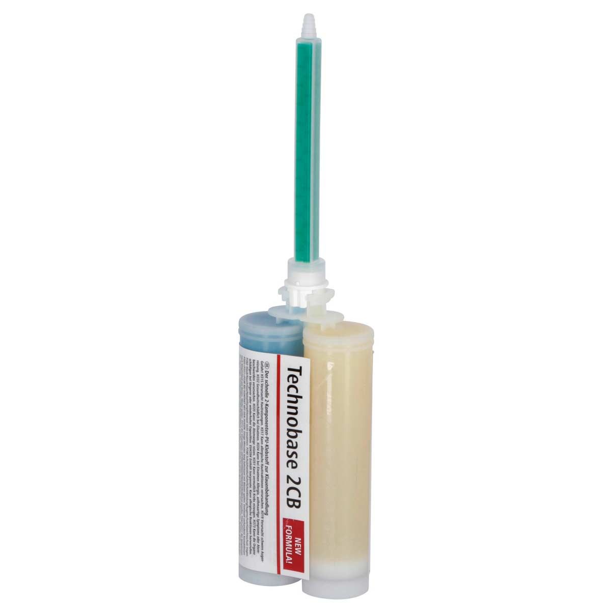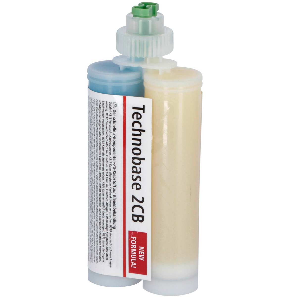 Le dernier adhésif à deux composants est Technobase 2cb Nouvelle formule pour un usage professionnel dans le domaine des soins modernes des sabots. La coloration bleue indique le bon mélange immédiatement après avoir pressé. La nouvelle formule a été optimisée dans les paramètres de vitesse de durcissement, de viscosité et de degré de dureté après polymérisation par rapport aux adhésifs à deux composants couramment disponibles sur le marché.