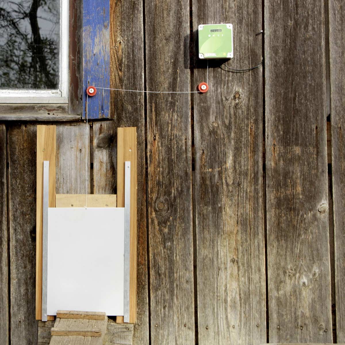 Porte de poulailler - ouverture et fermeture automatique des portes pour poulailler La porte automatique pour poulets permet d'ouvrir et de fermer automatiquement les volets, les portes ou les glissières des poulaillers en fonction de l'heure ou de la luminosité. La glissière électronique ouvre et ferme la porte de votre poulailler selon vos besoins. La trappe à poulailler ouvre la glissière verticale de votre poulailler lorsqu'il fait clair et referme la porte lorsqu'il fait sombre. En outre, il est possible de faire fonctionner l'appareil manuellement. Cela peut se faire directement sur l'appareil ou avec le bouton manuel. La sensibilité de l'interrupteur crépusculaire intégré peut être réglée individuellement afin d'éviter toute ouverture involontaire en cas d'orage, d'éclairs à proximité ou de projecteurs à proximité. S'il y a un animal sous le curseur pendant le processus de fermeture de la porte automatique pour poulailler, le moteur de la porte pour poulailler est automatiquement arrêté à l'ouverture de la porte et continue à se fermer lorsque l'animal s'est libéré. La fonction de la porte de poulailler: Le moteur intégré de la porte automatique pour poulailler est commandé par un interrupteur crépusculaire et ainsi l'ouverture ou la fermeture d'un coulisseau vertical est réalisée au moyen d'un câble de traction. Un fonctionnement manuel est également possible. Le boîtier de la porte à ouverture automatique est extrêmement stable et protège l'électronique fine de l'humidité, de la saleté et de la lumière du soleil. Placé dans une position légèrement protégée, la glissière électronique, grâce à ses composants extrêmement durables, durera très longtemps. La porte de poulailler à ouverture automatique a plusieurs fonctions pour ouvrir ou fermer la trappe: Capteur de lumière: la porte de poulailler est commandé par un capteur de lumière en fonction de la lumière du jour Timer: Le contrôle de la porte du poulailler dépend du temps. Une distinction peut être faite entre les jours de semaine et les week-ends Commande manuelle: directement sur l'appareil ou via un bouton connecté Le porte de poulailler en un coup d'oeil: Porte automatique pour poulailler Possibilité de fonctionnement sur secteur et sur batterie Commande en fonction de la lumière du jour avec capteur de luminosité Contrôle en fonction du temps Commande manuelle, sur l'appareil ou via un bouton poussoir connecté Contenu de la livraison: Commande avec moteur intégré et câble de traction Adaptateur secteur 230V Piles (4 x AA, déjà dans l'appareil) Capteur de luminosité Jeu de poulies de renvoi (4 pièces) Instructions d'utilisation Montage de la porte automatique sur le poulailler: Le montage de la porte électronique pour poulailler est très simple : vous assemblez d'abord le coulisseau, vous le tirez en position ouverte, vous montez le dispositif de la porte pour poulailler de manière à pouvoir le connecter au coulisseau au moyen de la boucle (cordon enroulé = état de livraison). Ensuite, insérez les piles - c'est prêt! Prévoyez la situation de montage et surtout le cordon de la porte du poulailler à l'appareil. Mesurez l'ouverture de la porte du poulailler et préparez une porte coulissante adaptée avec des rails de guidage. Vous trouverez dans notre boutique des curseurs adaptés et des poulies supplémentaires comme accessoires. Si vous souhaitez alimenter la porte automatique pour poulailler avec la tension du réseau, assurez-vous qu'une prise de 230 volts est disponible à proximité. Le bloc d'alimentation et le lieu d'installation de l'appareil doivent être protégés de la pluie. La porte automatique pour poulailler n'est pas compatible avec les glissières ou les volets qui ont un mécanisme de verrouillage automatique. Données techniques: Poids minimal du curseur: 0,5 kg Max. Poids du curseur: 2,5 kg Max. Hauteur de levage: 60 cm Alimentation électrique: fonctionnement sur secteur 230 Volt (adaptateur secteur pour fonctionnement en 12 Volt) ou fonctionnement sur piles (4 x AA) Modèles: Porte de poulailler automatique sans trappe Porte de poulailler automatique pour poulets avec trappe 22 x 33 cm (pour les poulets normaux) Porte de poulailler automatique pour poulets avec trappe 30 x 40 cm (pour les poulets normaux et plus grands) Porte de poulailler automatique avec trappe 43 x 40 cm (adapté à la détention à des fins commerciales selon l'ordonnance sur la détention des animaux d'élevage)
