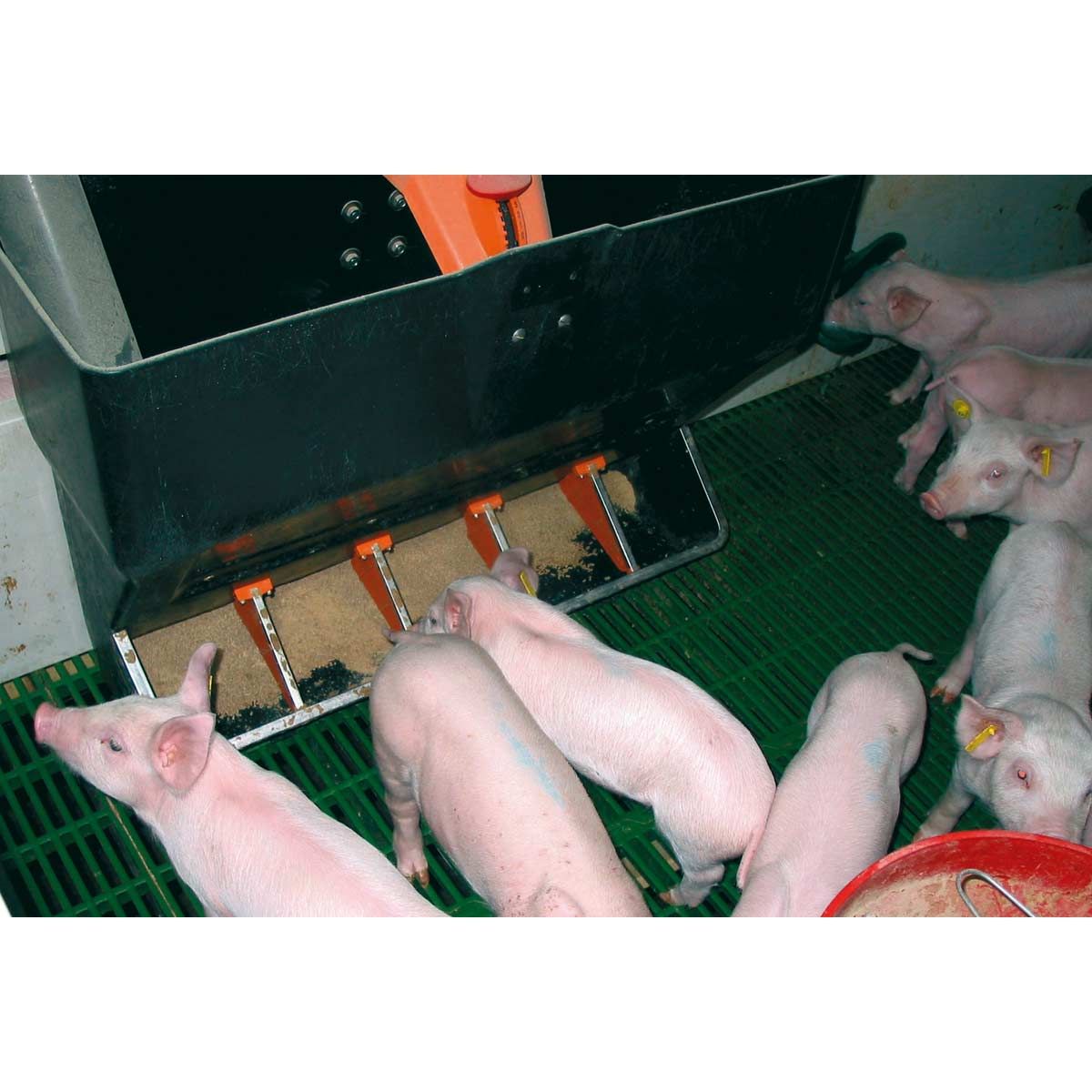 Le Chargeur automatique tr-5 régule de manière pratique et précise la ration alimentaire de vos porcelets. L'alimentation des porcs est distribuée en 12 positions, même avec une trémie pleine. Grâce au système de raclage interne, l'alimentation peut être idéalement dosée ou même complètement coupée. Avec bord de protection anti-mordant en acier inoxydable. Hygiénique et facile à nettoyer, car la mangeoire n'a pas de coins où l'on peut laisser des aliments.