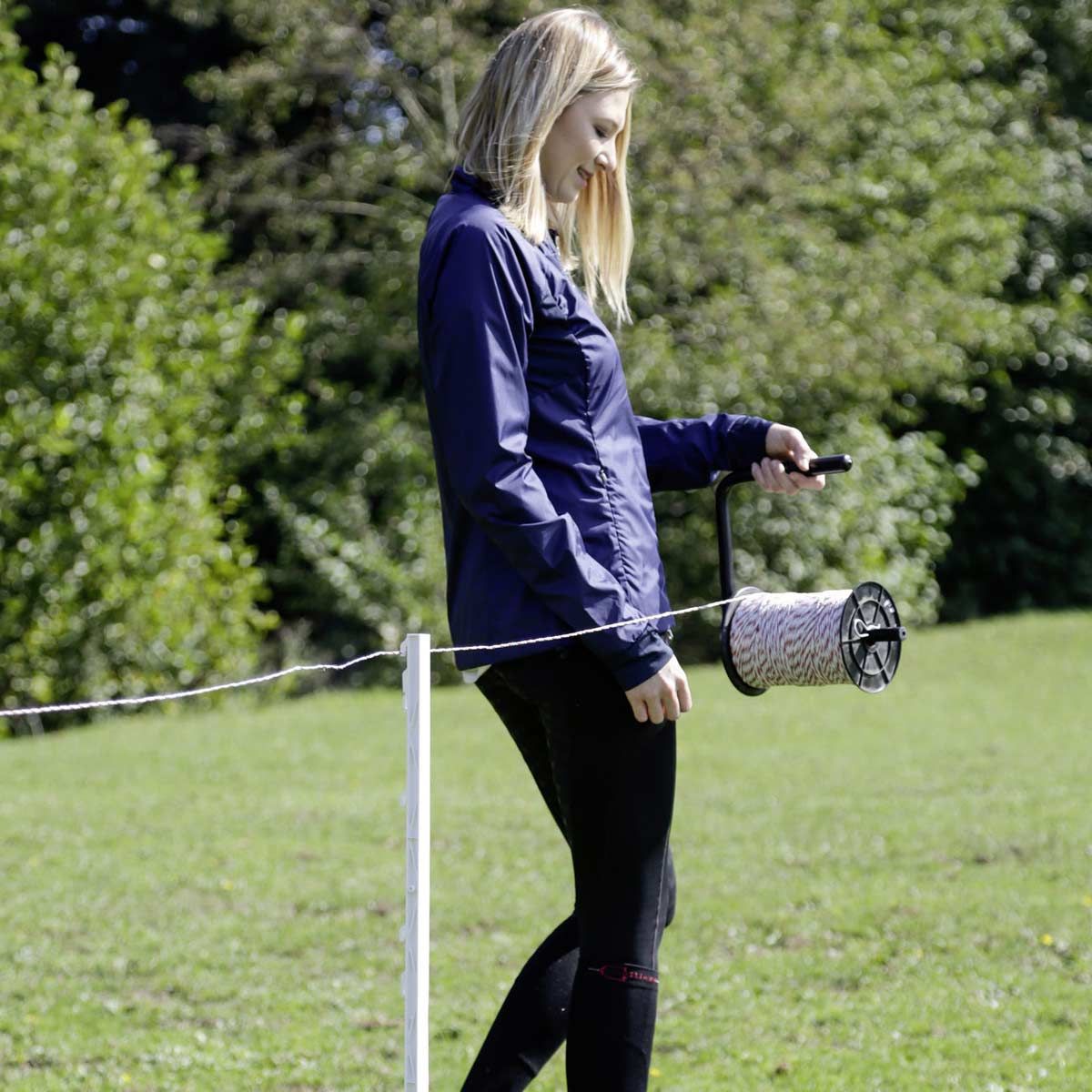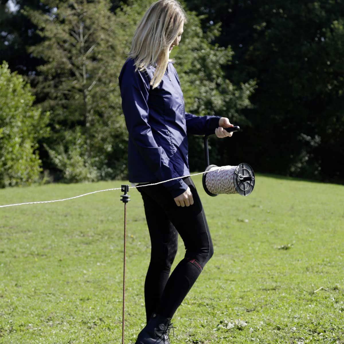 Le distributeur pratique à une main est idéal pour travailler avec du matériel d'échelle sur la clôture de pâturage. Il facilite le déroulement en toute sécurité et permet d'accrocher en même temps les torons, les cordes ou les rubans dans les isolateurs de la clôture. Le distributeur peut être utilisé de manière universelle et convient pour des bobines jusqu'à 250 mm de hauteur ou pesant jusqu'à 3 kg.
