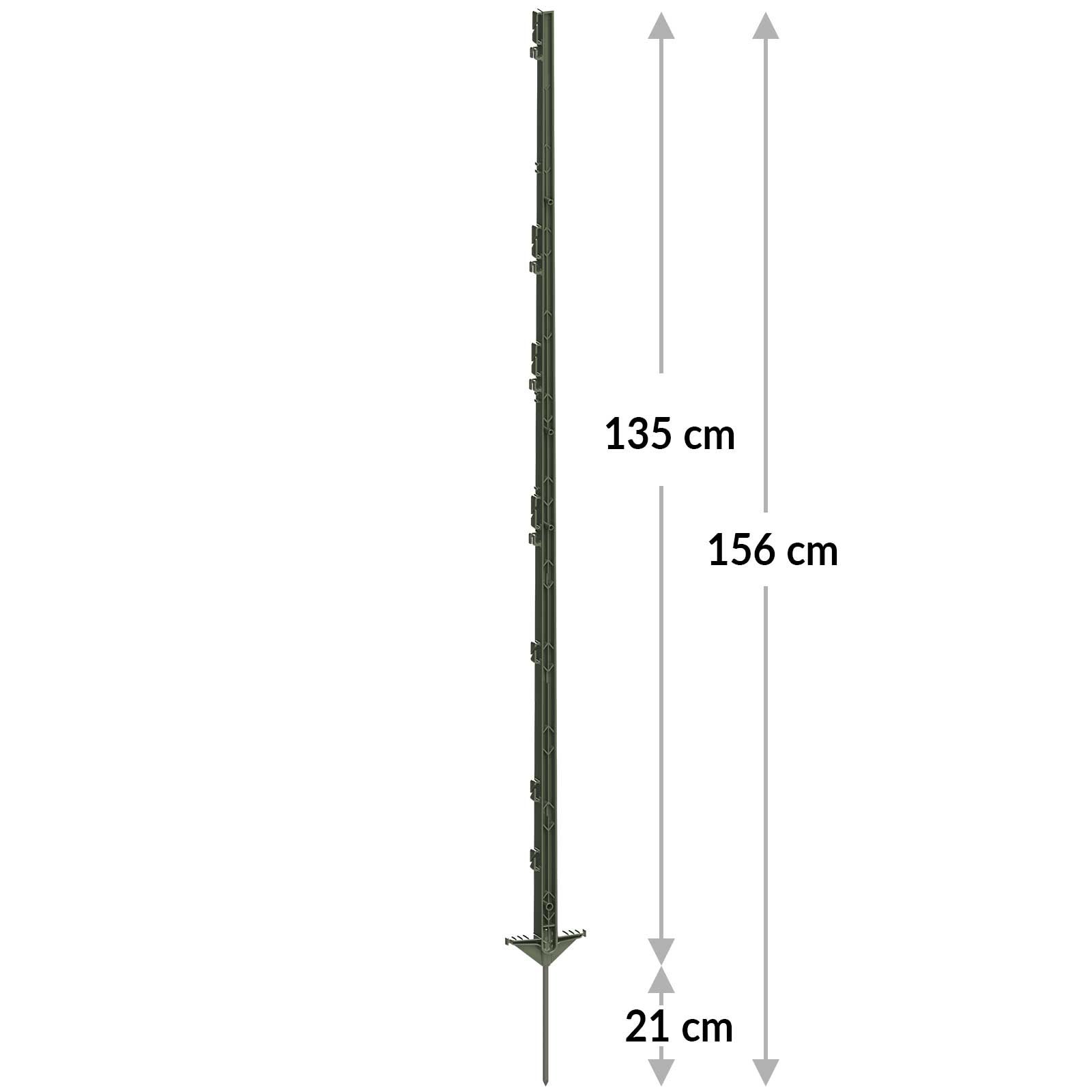 Ce piquet de clôture électrique dispose d'un double marche-pied pratique qui aide à enfoncer facilement et confortablement le piquet dans le sol. La pointe galvanisée de 21 cm offre une stabilité supplémentaire et permet au piquet de clôture de rester bien enfoncé dans le sol, même en cas d'influences extérieures comme le vent. La longueur totale du piquet en plastique est de 156 cm, la hauteurau-dessus du sol étant de 135 cm. Cela donne une hauteur suffisante pour clôturer efficacement même les grands animaux comme les chevaux.