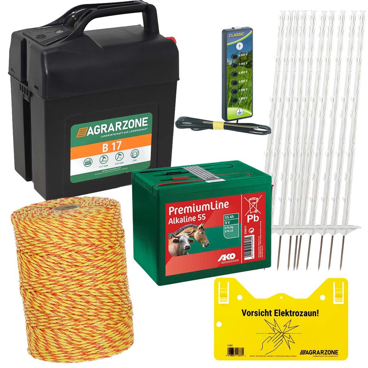 Le kit comprend l'électrificateur mobile Agrarzone B17, qui a été développée spécialement pour la garde d'animaux domestiques et de petits animaux, et une batterie sèche 9V 55 Ah. Grâce à son fonctionnement sur batteries, le kit pour chien est idéal pour les vacances, le camping, pour une utilisation lors d'événements ou de compétitions d'agilité. Le kit comprend également 250m de fil de clôture de pâturage très visible et 10 piquets en plastique avec 8 œillets pour fixer le fil. Cela vous permet d'adapter la hauteur et la longueur de la clôture à vos besoins individuels, jusqu'à 8 rangées ou 250 m de longueur sont possibles!