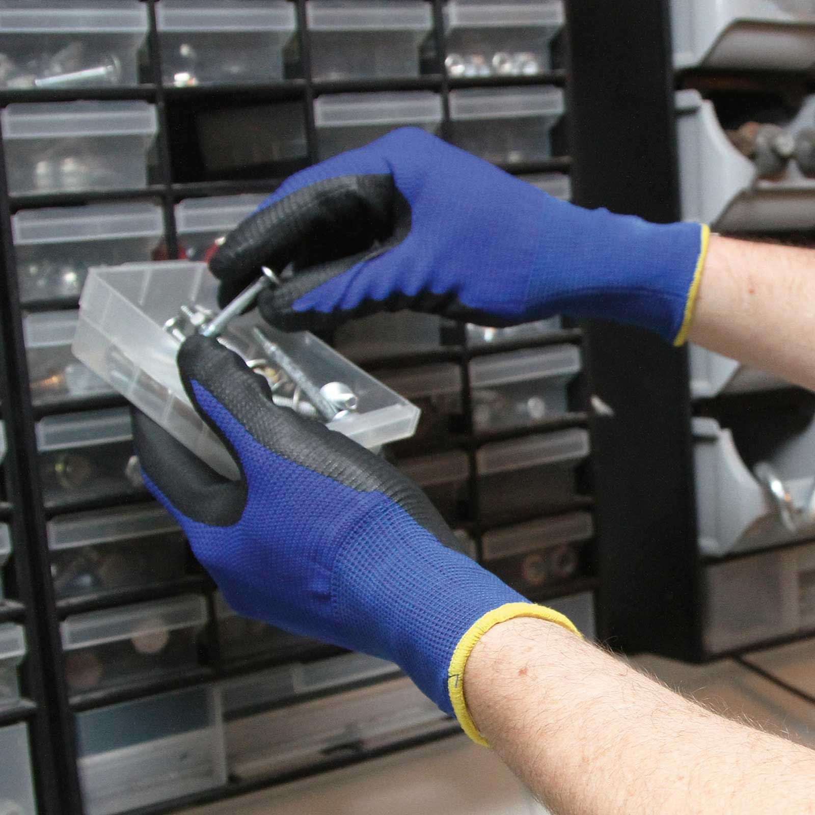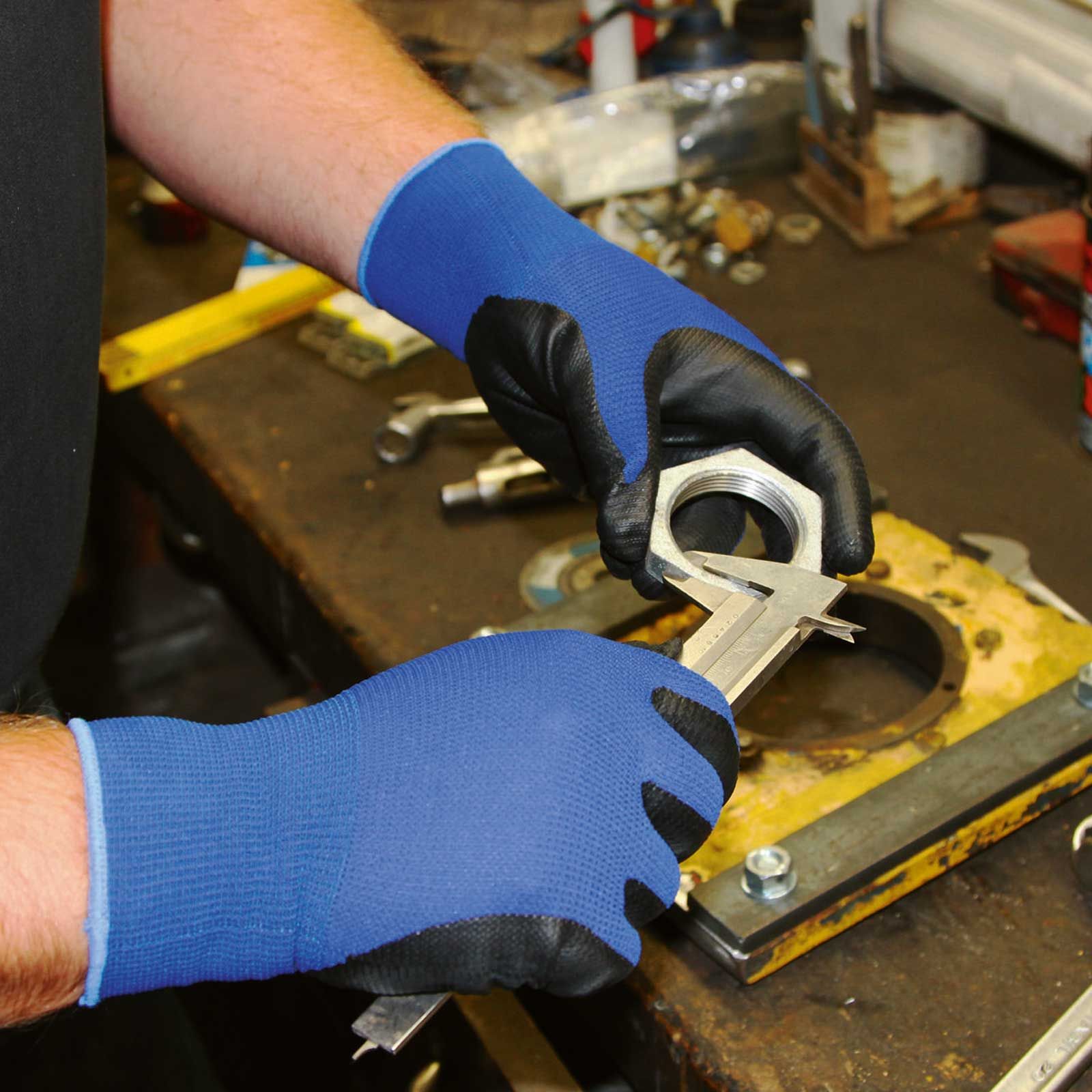 Le gant en tricot fin sans couture est fabriqué en nylon (jauge 13) selon la méthode de tricotage U3 ondulé tricoté, ce que le Prévient la fatigue des mains, la main est bien ventilée et très bonne prise en main. Le gant de travail a un revêtement imperméable en mousse de nitrile souple et résistante à l'abrasion et est donc particulièrement adhérente même dans des conditions sèches, humides ou huileuses. En raison de l'excellent, ajustement ergonomique il est adapté à un usage permanent. Le gant en tricot fin est testé selon la norme en 388 / cat ii et est principalement utilisé dans la construction mécanique, l'industrie automobile et pour les travaux d'assemblage.