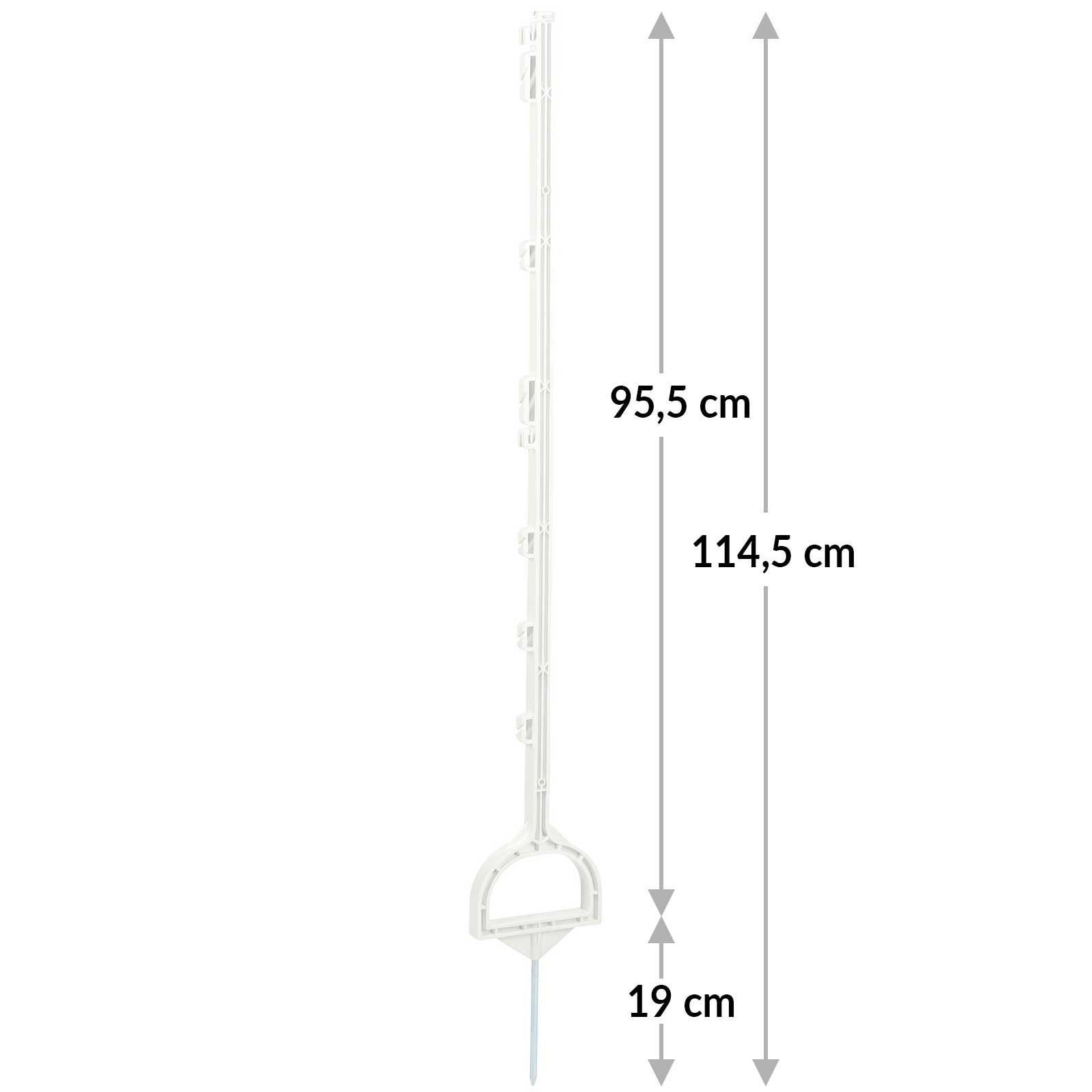 Nos piquets de clôture mobiles renforcés de fibre de verre sont parfaits pour tous ceux qui ont besoin d'un piquet de clôture mobile en plastique. Avec une longueur totale de 114,5 cm et une longueur hors sol de 95,5 cm, le piquet en plastique offre une hauteur optimale pour clôturer les moutons, les chiens et autres petits animaux, ainsi que pour repousser le gibier.