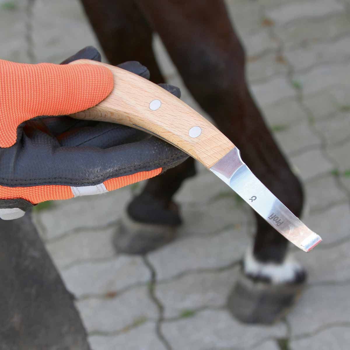 Couteau à sabot avec un manche en bois fin et un affûtage spécial pour un soin professionnel des sabots et des griffes.
