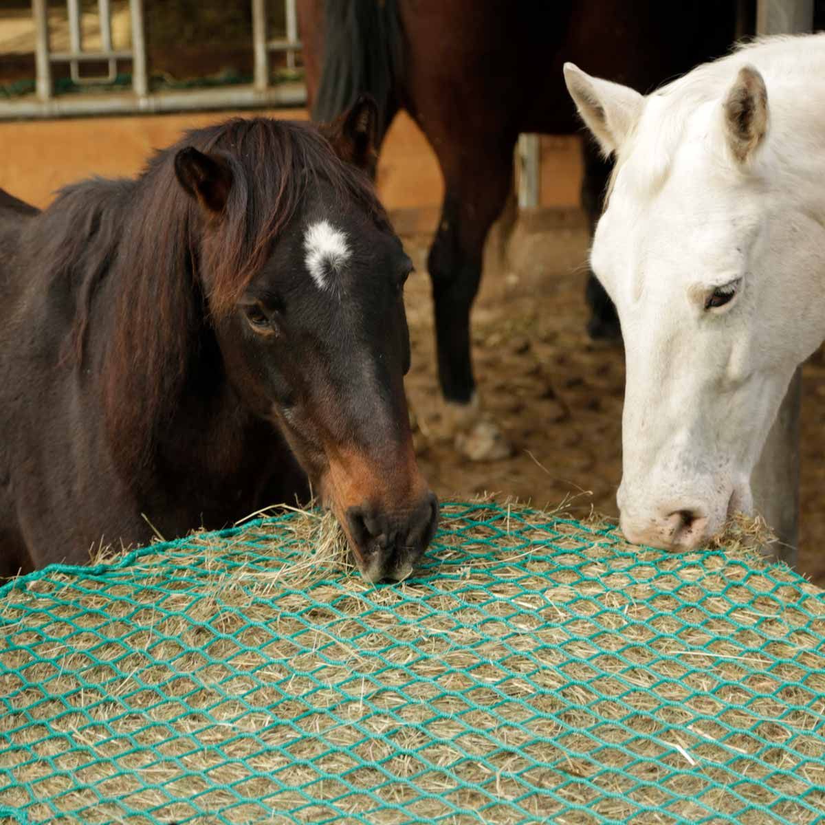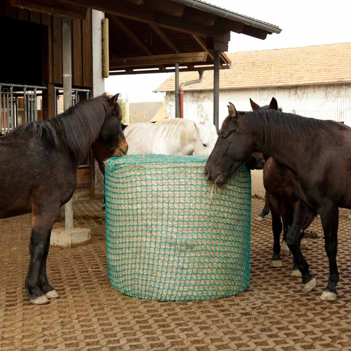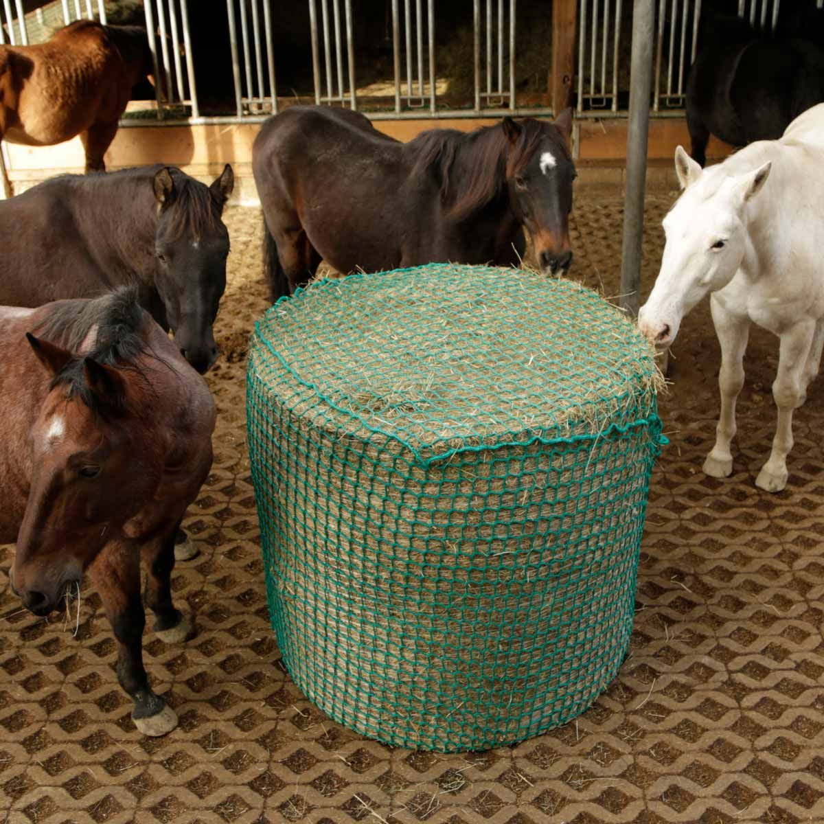 Filet d'alimentation pour le foin et balles de silo pour l'approvisionnement des chevaux en fourrage grossier.