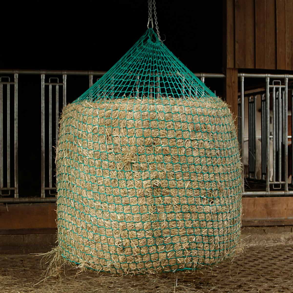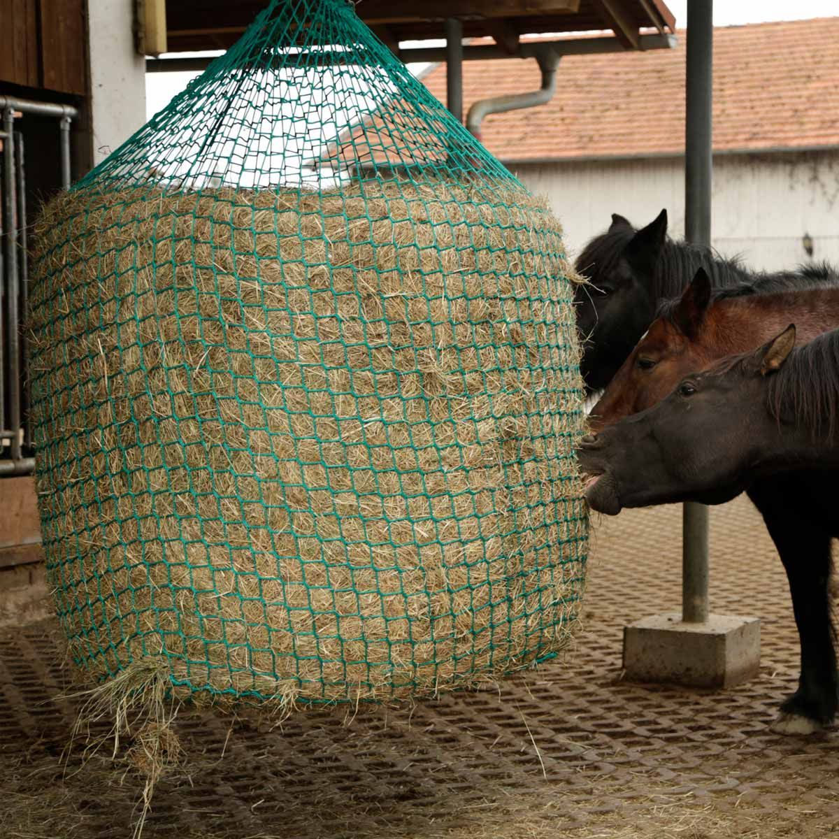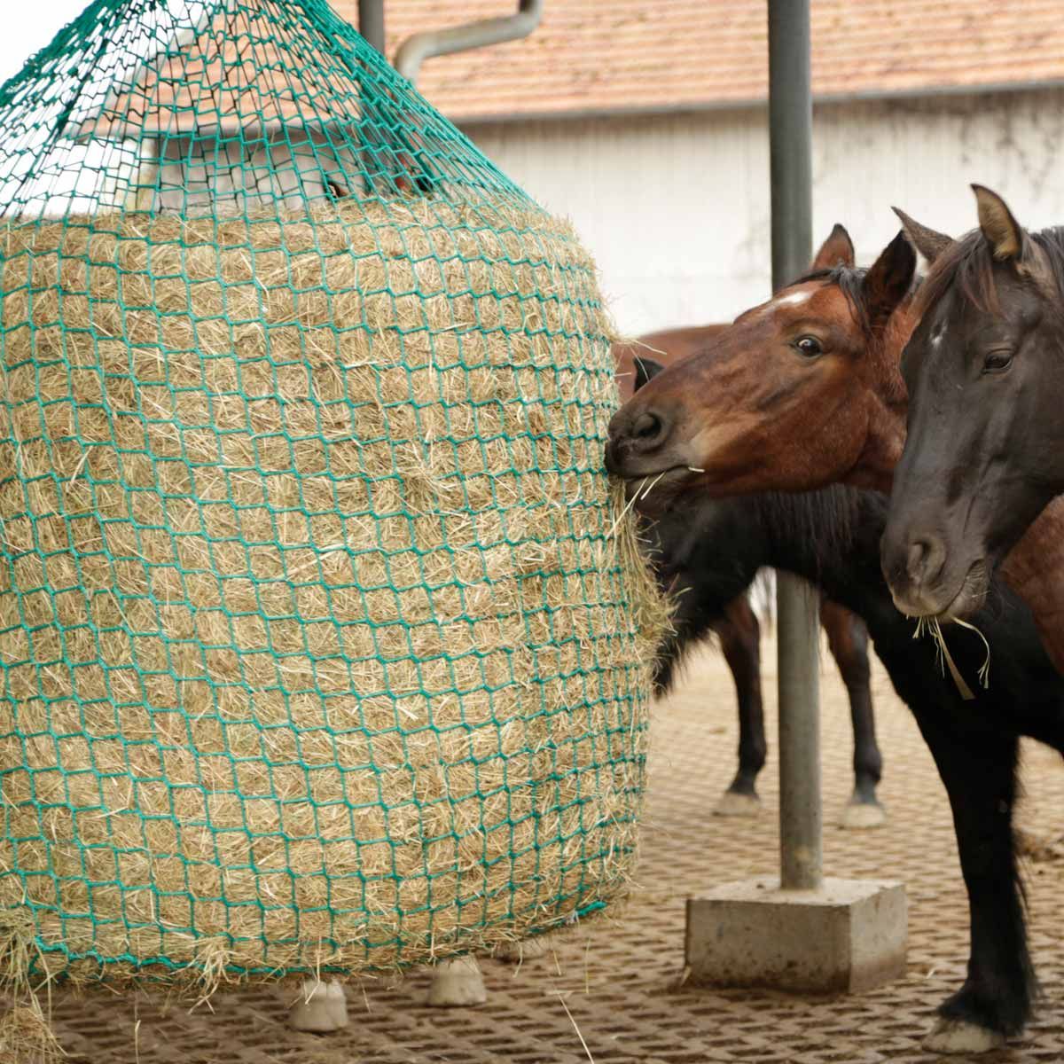 Filet d'alimentation pour la pré-tension suspendue des balles de foin et de silo pour l'approvisionnement des chevaux en fourrage grossier.