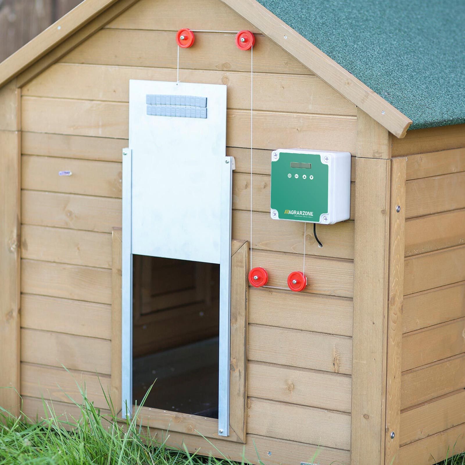 Le moteur intégré de la porte automatique pour poulets est commandé par un interrupteur crépusculaire et ainsi l'ouverture ou la fermeture d'une glissière verticale est réalisée au moyen d'un câble de traction. En outre, un fonctionnement manuel est possible. Le boîtier de la porte à ouverture automatique est extrêmement stable et protège l'électronique sensible de l'humidité, de la saleté et de la lumière du soleil. Placé dans une position légèrement protégée, la glissière électronique, grâce à ses composants extrêmement durables, durera très longtemps.
