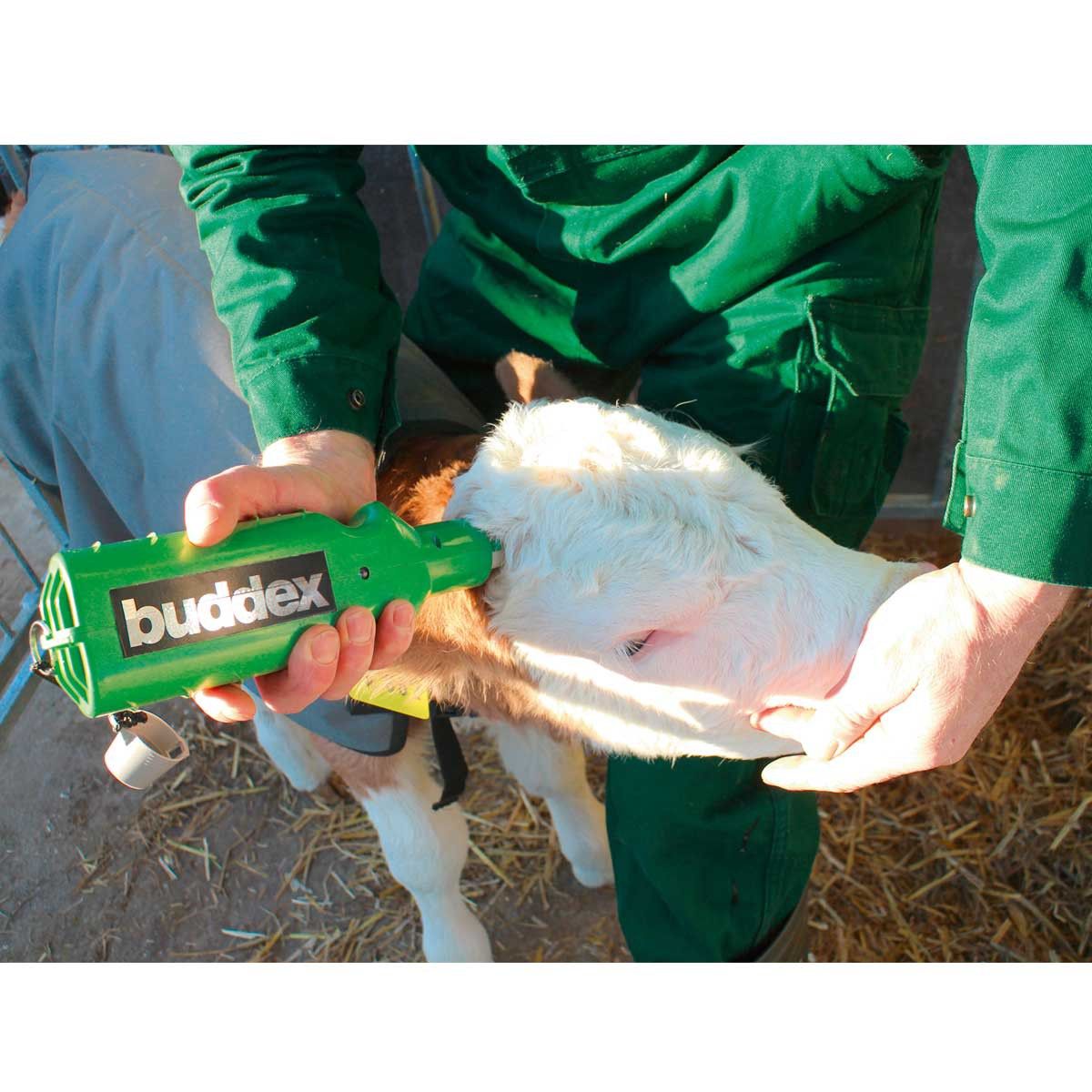 Le Dénudeur de batterie Buddex est optimale pour une écornage correct approprié. L'anneau brûlant unique empêche de manière fiable la croissance de la corne de manière respectueuse des animaux. En raison de la température élevée de 700 °C sur l'anneau brûlant, l'écornage pour le veau devient une question de secondes. La phase de chauffage ne commence qu'en appuyant sur l'attache de la corne. Il n'y a pas d'arbre qui soit complètement chauffé et donc aucun risque de brûlure pour l'utilisateur.