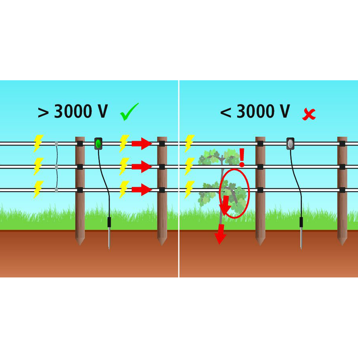 AKO Conseil d'expert: Placez le flash à impulsion à l'extrémité de votre système de clôture. D'un seul coup d'oeil, vous pouvez voir si la tension de maintien minimale de 2 500 V circule à l'extrémité de votre clôture et donc sur l'ensemble de votre système.