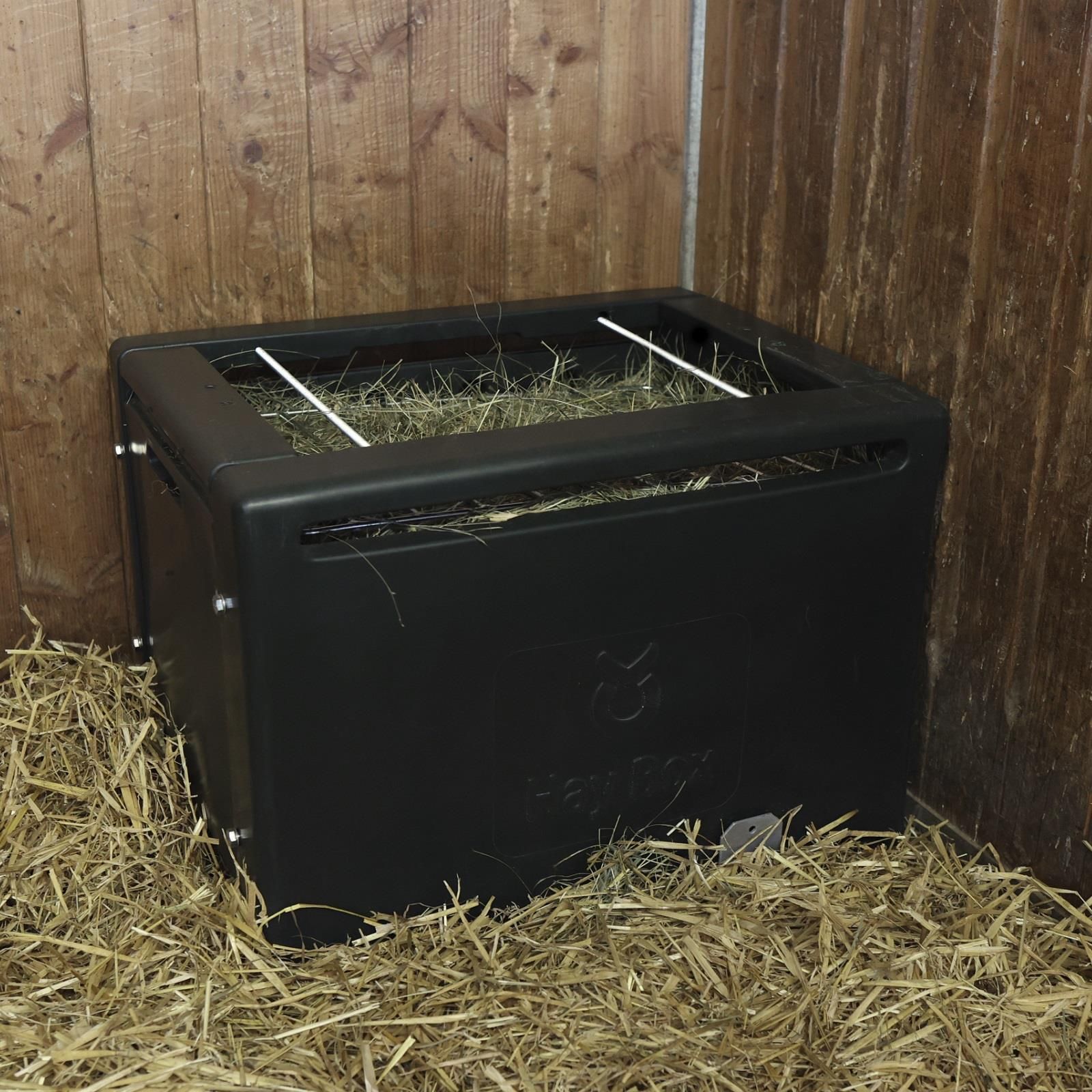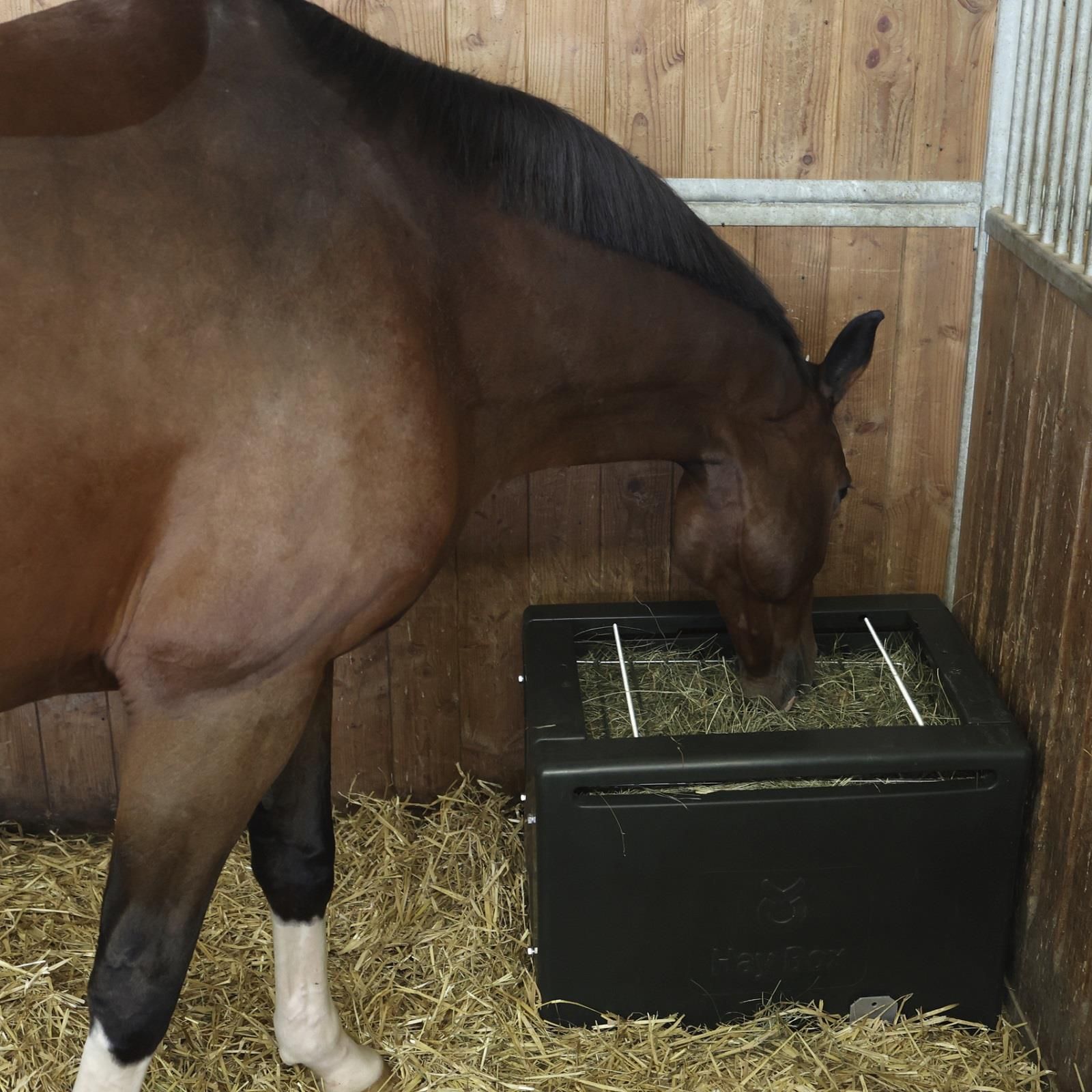 Le râtelier à foin HayBox pour poneys et chevaux, idéal pour les personnes allergiques à la poussière de foin et au foin mouillé ou vaporisé.