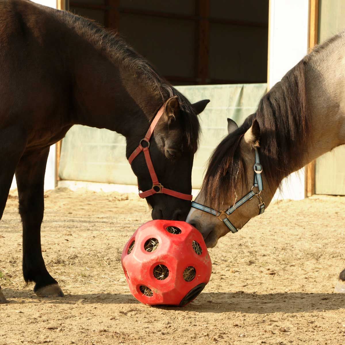 Le HeuBoy est idéal pour une utilisation dans Ecurie, pâturage ou enclos approprié. Les veaux et les chevaux peuvent utiliser le foin de 19 ouvertures d'alimentation de 70 mm de diamètre chacune et ils sont tellement occupés. Le plastique stable et résistant aux UV peut être ajusté avec jusqu'à 3 kg de foin être rempli. Le remplissage est possible via le Ouverture de remplissage de 116 mm de large avec bouchon à vis possible. Le HeuBoy peut également être suspendu à une corde ou à une chaîne, et les veaux aiment s'occuper avec la balle qui se balance.HeuBoy en un coup d'oeil: