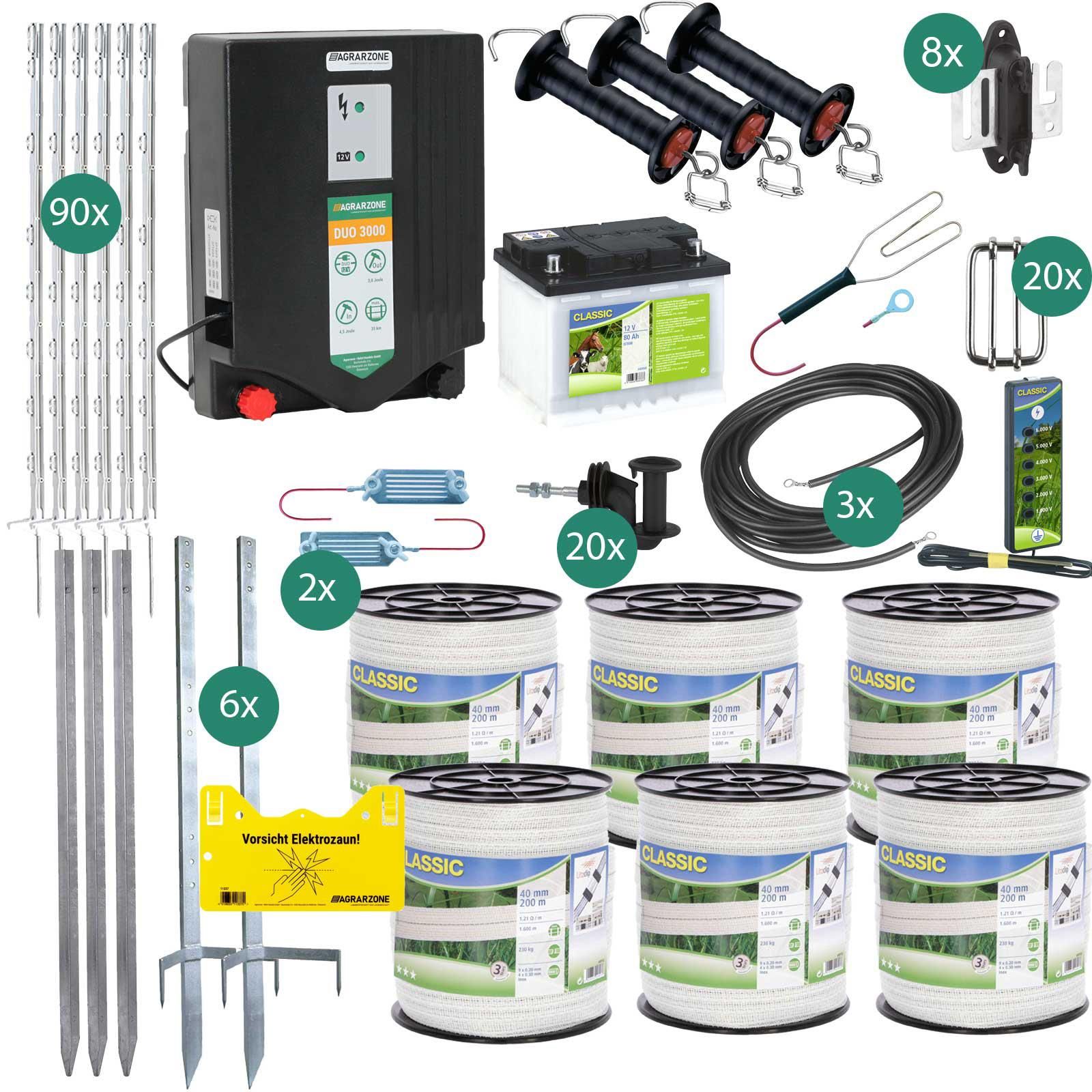 Kit complet de cloture electrique Agrarzone pour chevaux DUO3000 12V/230V, 4,5J, ruban 1200m, 1 porte