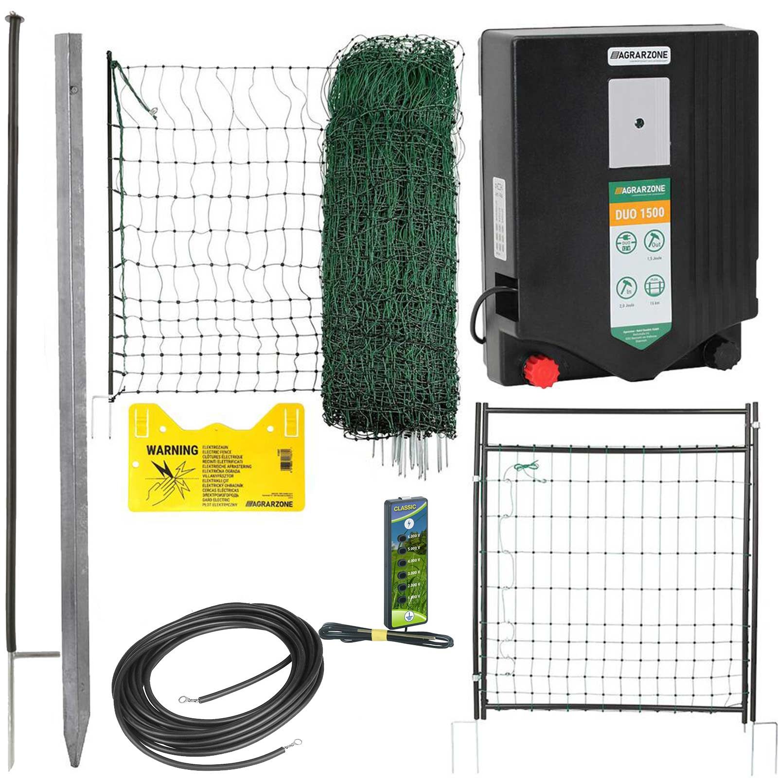 Kit complet de clôtures pour volailles Agrarzone - Set de démarrage mobile et puissant comprenant une porte de pâturage, une électrificateur de clôture de pâturage et un filet à volailles de 50 m.